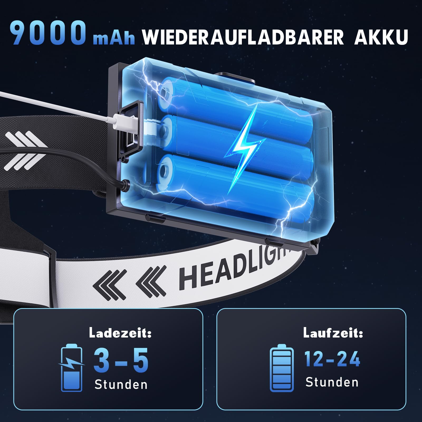 Diese SWZA Stirnlampe ist dein bester Begleiter für alle Outdoor-Abenteuer! Ultrahell, wiederaufladbar und mit cleverem Bewegungssensor - einfach die Hand vor die Lampe wischen und sie geht an oder aus.\\n\\nSuper Features:\\n- 3 Lichtmodi: Hell, Sparsam und Blink\\n- 90° neigbarer Kopf für perfekte Ausleuchtung\\n- Rotlicht für Nachtsicht und Sicherheit\\n- Type-C Schnellladung in 2-3 Stunden\\n- Kann als Powerbank fürs Smartphone dienen\\n- IPX7 wasserdicht - hält auch bei Regen stand\\n\\nDer Bewegungssensor ist genial: Einfach 3 Sekunden den Knopf drücken, dann mit Handbewegungen steuern - perfekt wenn du Handschuhe trägst oder beide Hände frei brauchst!\\n\\nBis zu 12 Stunden Laufzeit im Sparmodus - ideal für lange Camping-Trips, Nachtwanderungen oder Angeln. Mit Akku-Anzeige siehst du immer wie viel Saft noch da ist.\\n\\nLieferumfang: Stirnlampe, 2 Akkus, USB-Kabel, 6 Helm-Clips, Anleitung. Das komplette Set für echte Outdoor-Fans!