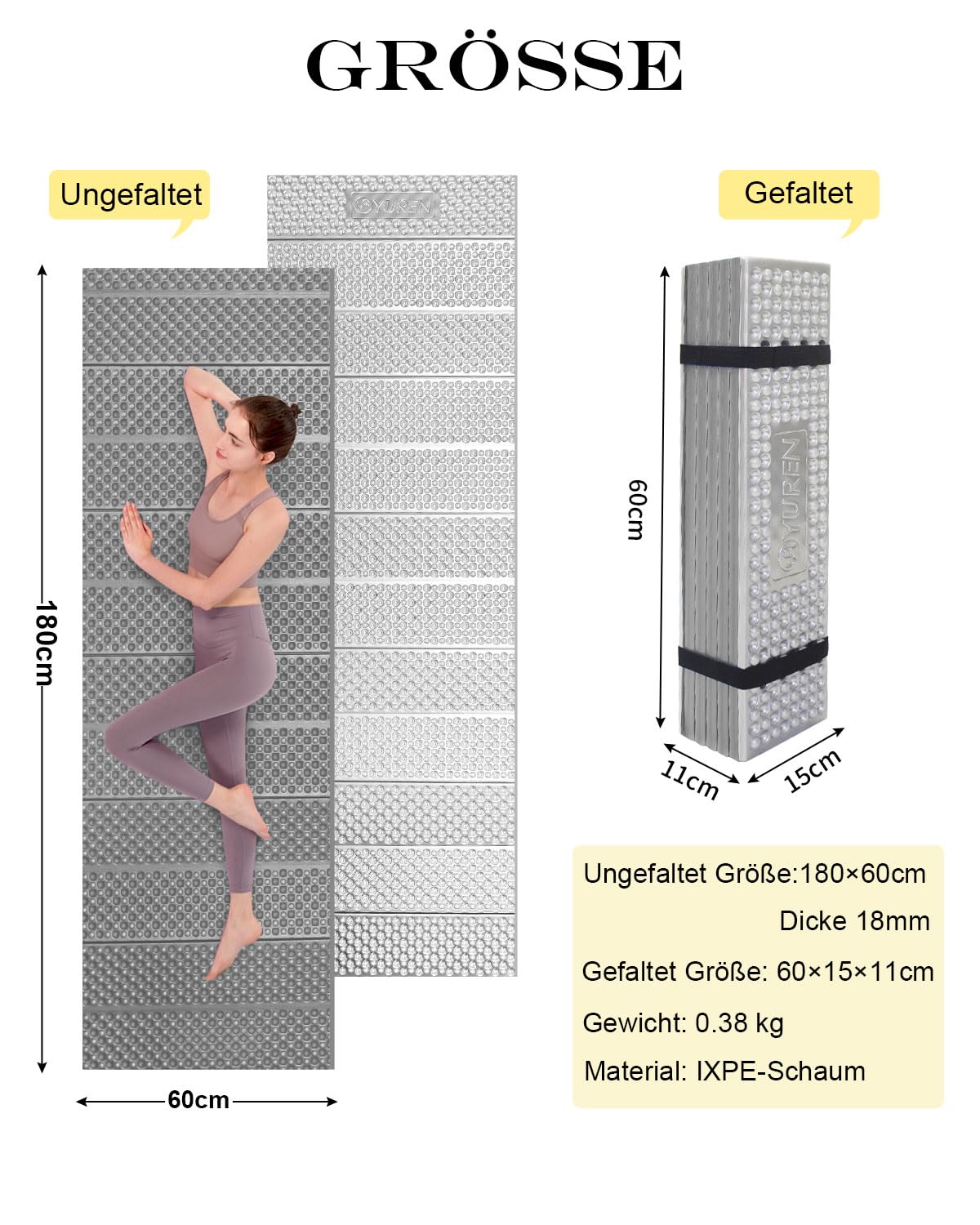 Perfekter Komfort für deine Outdoor-Abenteuer! Diese ultraleichte Camping-Isomatte misst 180x59x2 cm und wiegt nur 300 Gramm. Die silberne, wärmereflektierende Oberfläche mit Noppenstruktur schützt optimal vor Kälte und Feuchtigkeit vom Boden. Einfach zusammengefaltet auf nur 60x15x13 cm - ideal für Rucksackreisen. Perfekt für Camping, Wandern, Strandtage, Picknicks oder Sportevents. Die Schaumstoff-Matte bietet angenehmen Liegekomfort und isoliert auch auf kaltem Untergrund. Macht jede Outdoor-Aktivität komfortabler - ob als Schlafunterlage beim Camping oder als Sitzmatte beim Picknick. Leicht, praktisch und platzsparend - dein perfekter Begleiter für alle Abenteuer draußen!