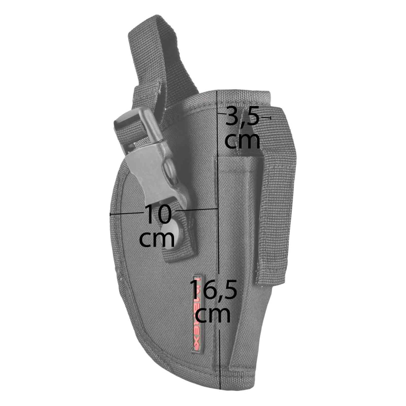 Mit der integrierten Magazintasche hast du dein Ersatzmagazin immer griffbereit. Bei nur 87g Gewicht merkst du das Holster kaum am Gürtel. Perfekt für große Pistolen und Revolver - ideal für Schreckschuss- und Airsoft-Waffen.