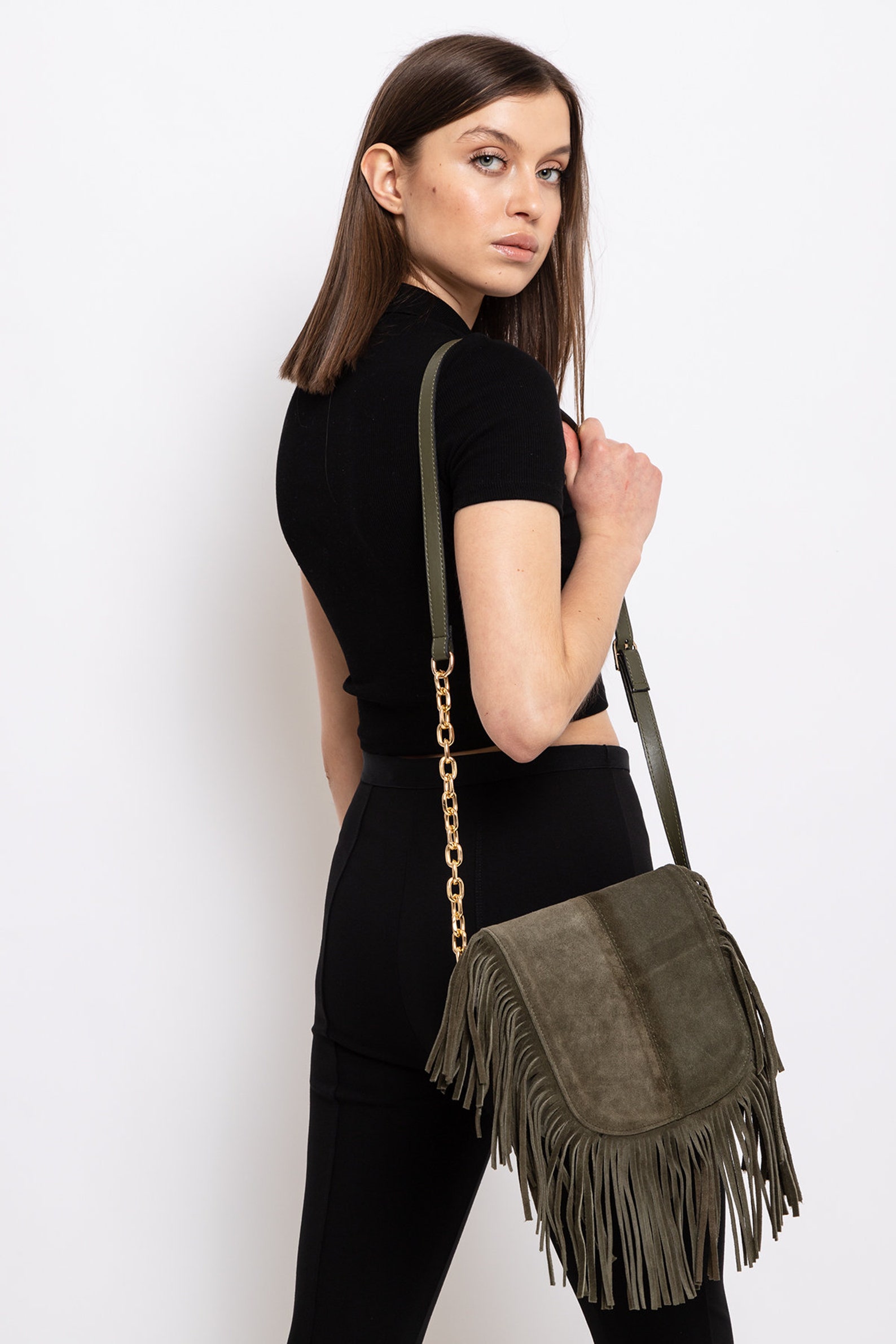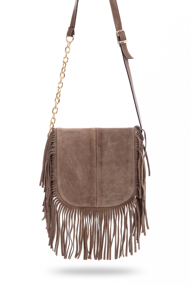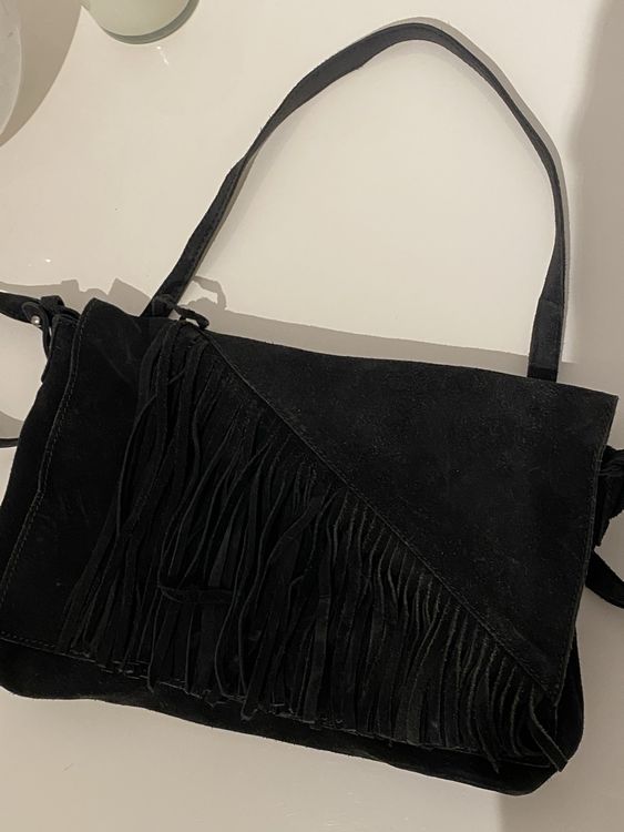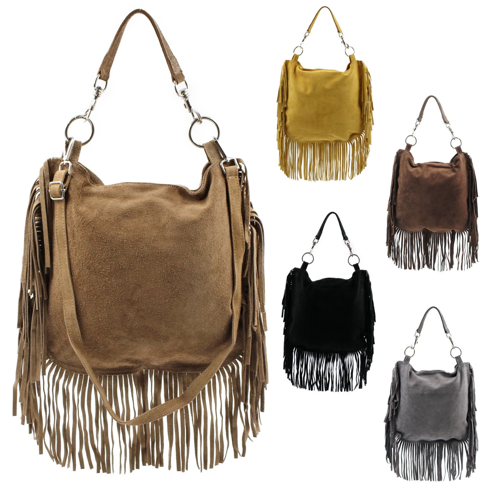 Stylische Umhängetasche aus echtem Wildleder mit coolen Fransen - 100% Made in Italy! Dieses absolute Lieblingsstück ist perfekt für jeden Anlass. In zwei Größen erhältlich: 22x26x4cm oder 25x16x8,5cm. Das hochwertige Veloursleder fühlt sich nicht nur toll an, sondern ist auch super langlebig. Viel Stauraum für Geldbörse, Smartphone, Make-up, Schlüssel und alles, was du täglich brauchst. Die elegante Farbe kombiniert sich mit fast jedem Outfit. Ob für die Arbeit, zum Shoppen oder für den Abend - diese Tasche macht immer eine gute Figur. Italienische Qualität, die man sieht und spürt!