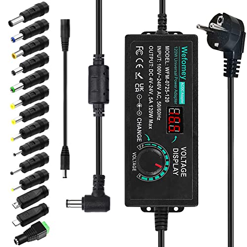 Das vielseitige Netzteil für alle Fälle! Dieses einstellbare 120W Netzteil mit 5A Ausgangsstrom deckt den Bereich von 3V bis 24V ab und ist damit perfekt für zahlreiche Elektronikgeräte. Das große LED-Display zeigt die eingestellte Spannung klar an und verhindert so Beschädigungen durch falsche Einstellungen. Im Lieferumfang sind 14 verschiedene DC-Adapter enthalten - darunter Micro USB, Type C und viele gängige Steckergrößen. Der Umpolungskonverter erweitert die Einsatzmöglichkeiten für Geräte mit negativer Polung. Mit integriertem Überspannungs-, Überstrom- und Übertemperaturschutz ist das Netzteil sicher im Betrieb. Ideal für LED-Beleuchtung, Spielzeug, Überwachungskameras, Audiogeräte und vieles mehr. Die weltweite Eingangsspannung von 100-240V macht es zum perfekten Reisebegleiter. Ein echter Allrounder für Werkstatt, Labor oder Heimgebrauch - mit diesem einen Netzteil ersparst du dir viele einzelne Netzteile und hast immer die passende Spannung zur Hand!