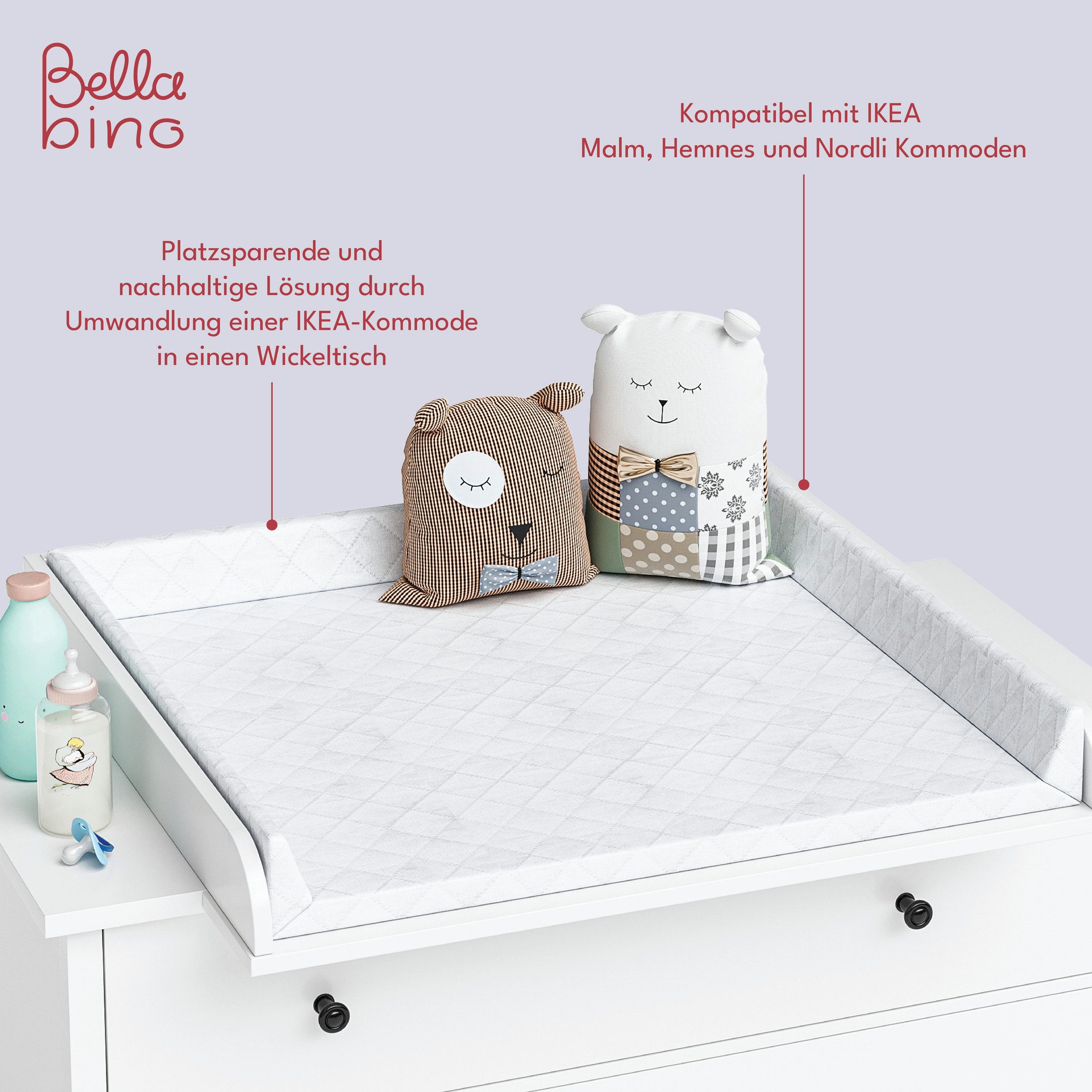 Praktischer Wickelaufsatz für deine IKEA Kommode! Perfekt passend für Malm, Hemnes und Nordli Serien - so verwandelst du deine Kommode im Handumdrehen in einen vollwertigen Wickeltisch. Die großzügige Wickelfläche (80x74 cm) bietet plenty Platz für dein Baby und alle Pflegeutensilien. Die hohen Schutzkanten sorgen für maximale Sicherheit beim Windelwechsel. Einfach auf die Kommode legen - fertig! Wenn du mal keinen Wickeltisch mehr brauchst, nimmst du den Aufsatz einfach wieder ab. Die weiße Oberfläche ist super pflegeleicht und passt sich deinem Einrichtungsstil an. Mit nur 4,4 kg ist der Aufsatz leicht zu handhaben und platzsparend zu verstauen. So sparst du dir einen extra Wickeltisch und hast trotzdem alles, was du für die Baby-Pflege brauchst. Einfach genial!