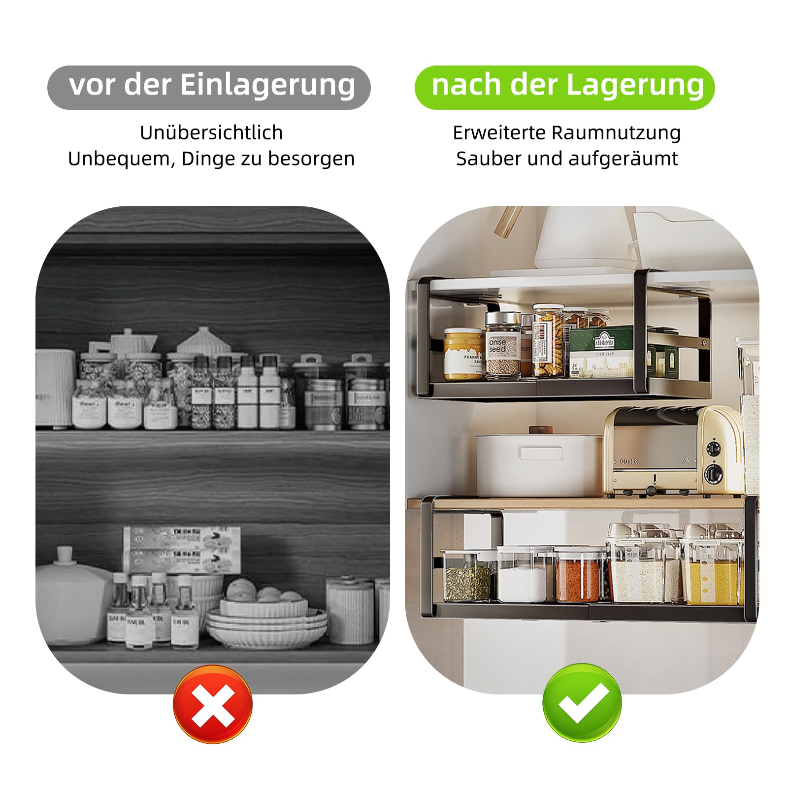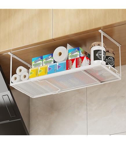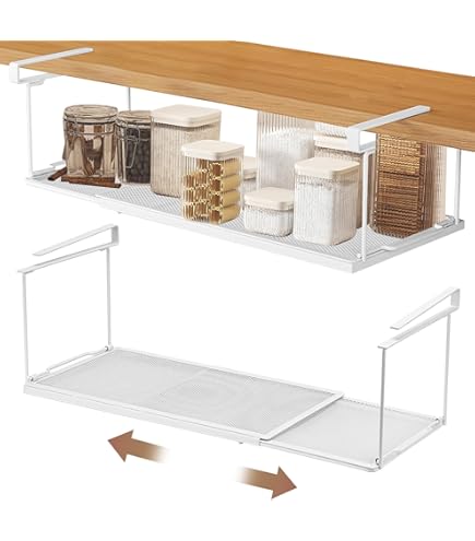 Schluss mit unordentlichen Schränken! Dieser Aenmido Hängekorb schafft sofort extra Stauraum unter deinen Regalen und Schränken. Er ist komplett verstellbar von 38-70 cm Breite und passt sich damit fast jedem Schrank an. Ohne Bohren montiert - einfach die Halterungen auf die gewünschte Breite einstellen und einklicken. Perfekt für Mieter! Aus robustem, rostbeständigem Metall und mit einer Tragkraft von bis zu 7 kg pro Ebene. Mit 4 abnehmbaren Haken für Löffel, Tassen oder Deko. Ob in der Küche für Gewürze und Konserven, im Bad für Beauty-Produkte, im Flur für Schuhe oder im Home Office für Bürozubehör - dieser Organizer ist super vielseitig. Räum endlich deine Arbeitsplatten auf und hab alles griffbereit, aber ordentlich verstaut. Die Abstände sind anpassbar für hohe Flaschen, Teller, Schuhe oder sogar Tablets und Bücher. Ein echter Alleskönner für mehr Ordnung in deinem Zuhause!