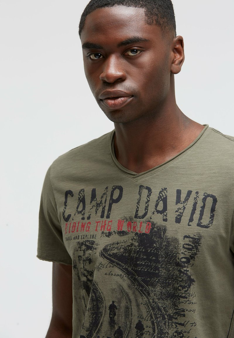 Hey, dieses Camp David T-Shirt ist genau das Richtige für alle, die lässigen Style lieben! Der V-Ausschnitt gibt dem Shirt diesen coolen, entspannten Look, der super zu Jeans oder Chinos passt. Der Used-Look mit Photoprint auf der Vorderseite und dem Logo-Print auf dem Ärmel verleiht dem Shirt diesen individuellen Charakter. Die Flammgarnstruktur fühlt sich nicht nur mega angenehm an, sondern sieht auch noch total stylisch aus. Regular Fit heißt: Sitzt bequem, nicht zu eng, nicht zu weit - einfach perfekt! Die Kontrastnähte an Schultern und Seiten geben dem Shirt diesen besonderen Detail-Reichtum. Ob für den Alltag, zum Weggehen oder einfach nur zum Chillen - dieses T-Shirt macht immer eine gute Figur. Aus hochwertiger Baumwolle, die sich super tragen lässt. Ein echter Basic, den du immer wieder anziehen wirst!