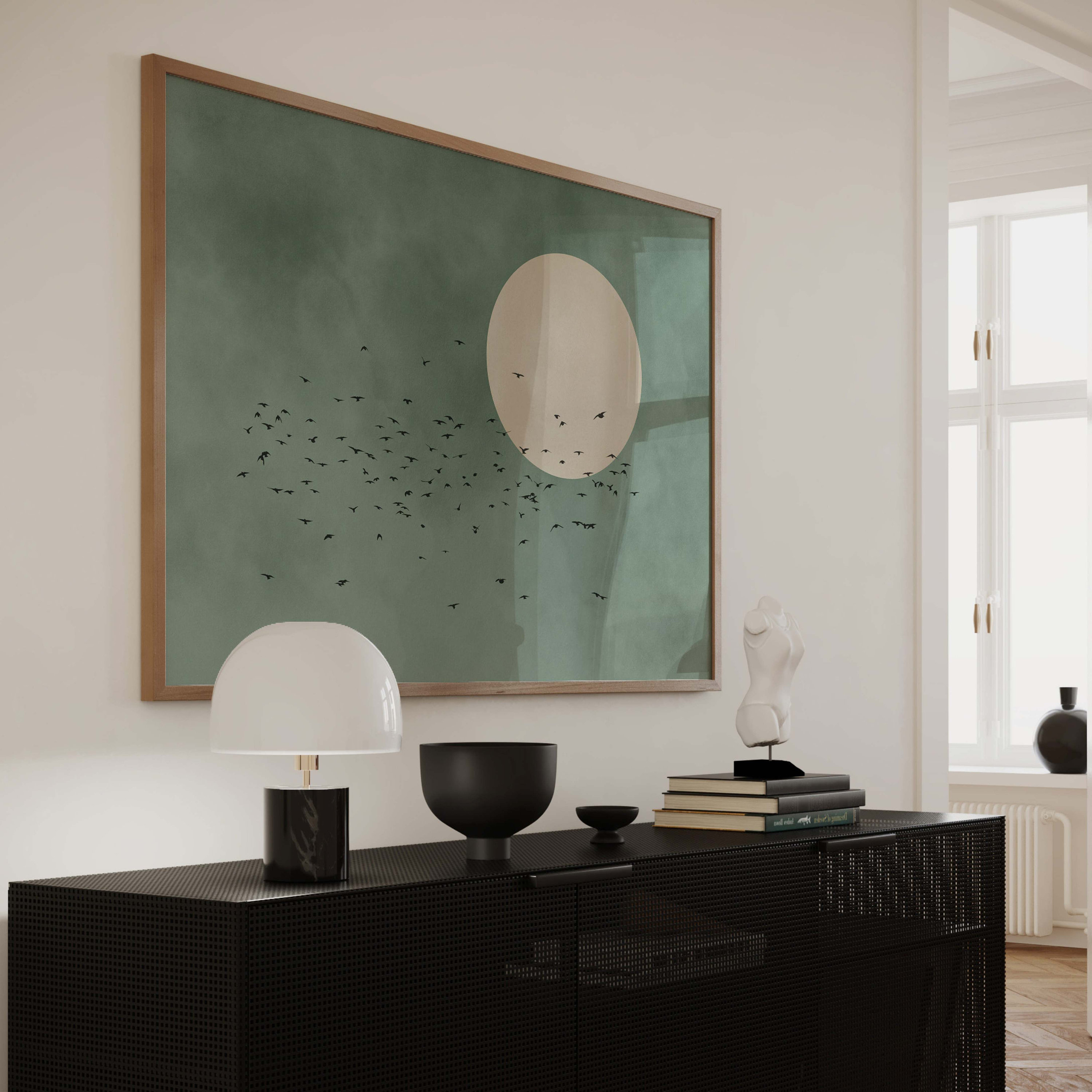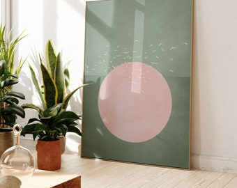 Bring Farbe in deine vier Wände! Dieses abstrakte Leinwandbild zeigt eine stilisierte Sonne mit fliegenden Vögeln in beruhigenden Grüntönen. Im trendigen Japandi-Stil, perfekt für ein entspanntes Wohngefühl. Maße 50x70cm, ohne Rahmen - du kannst es selbst rahmen oder einfach so aufhängen. Hochwertiger Druck mit ökologischen Tinten, verblasst nicht und riecht nicht. Sieht super aus im Wohnzimmer, Schlafzimmer oder Flur. Macht aus jeder weißen Wand sofort einen Hingucker. Einfach aufhängen und sich am neuen Wohlfühlambiente erfreuen. Auch toll als Geschenk für Einzug oder Geburtstag. Bringt Natur und Ruhe in dein Zuhause - einfach schön anzusehen!