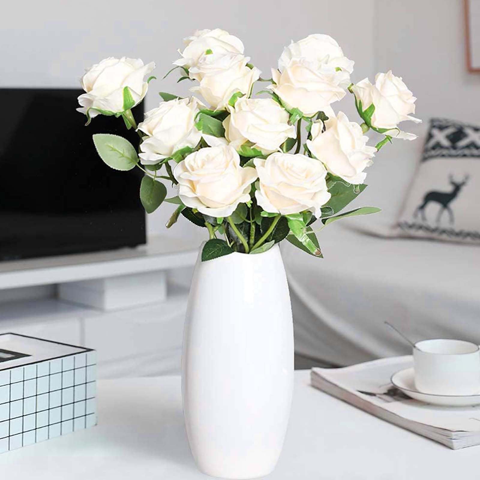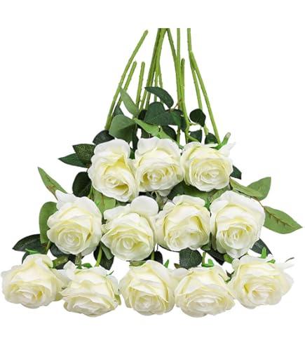 Romantik ohne Pflegeaufwand! Diese 12 künstlichen Rosen in Weiß sehen täuschend echt aus und bleiben für immer schön. Mit 52 cm Höhe und 7 cm Blütendurchmesser - perfekt für Vasen oder Gestecke. Hergestellt aus hochwertigem Flanell, viel natürlicher als Plastikblumen. Die Metalldrähte in den Stielen lassen sich leicht biegen und formen - ideal für individuelle Arrangements. Perfekt für Hochzeiten, Partys, Valentinstag oder als Dauerdekoration für Zuhause. Kein Gießen, kein Verwelken, keine Allergien - einfach genießen! Falls die Blumen durch den Transport gedrückt wurden: Einfach mit Fön auf niedriger Stufe aufbügeln und sie sehen wieder wie neu aus. In Weiß, Rot, Burgunder, Blau und Lila erhältlich. Auch toll für DIY-Projekte wie Kränze oder Brautsträuße. Für alle, die Blumen lieben, aber keine Zeit für Pflege haben. Einfach hinstellen und die Schönheit genießen - jahrelang!