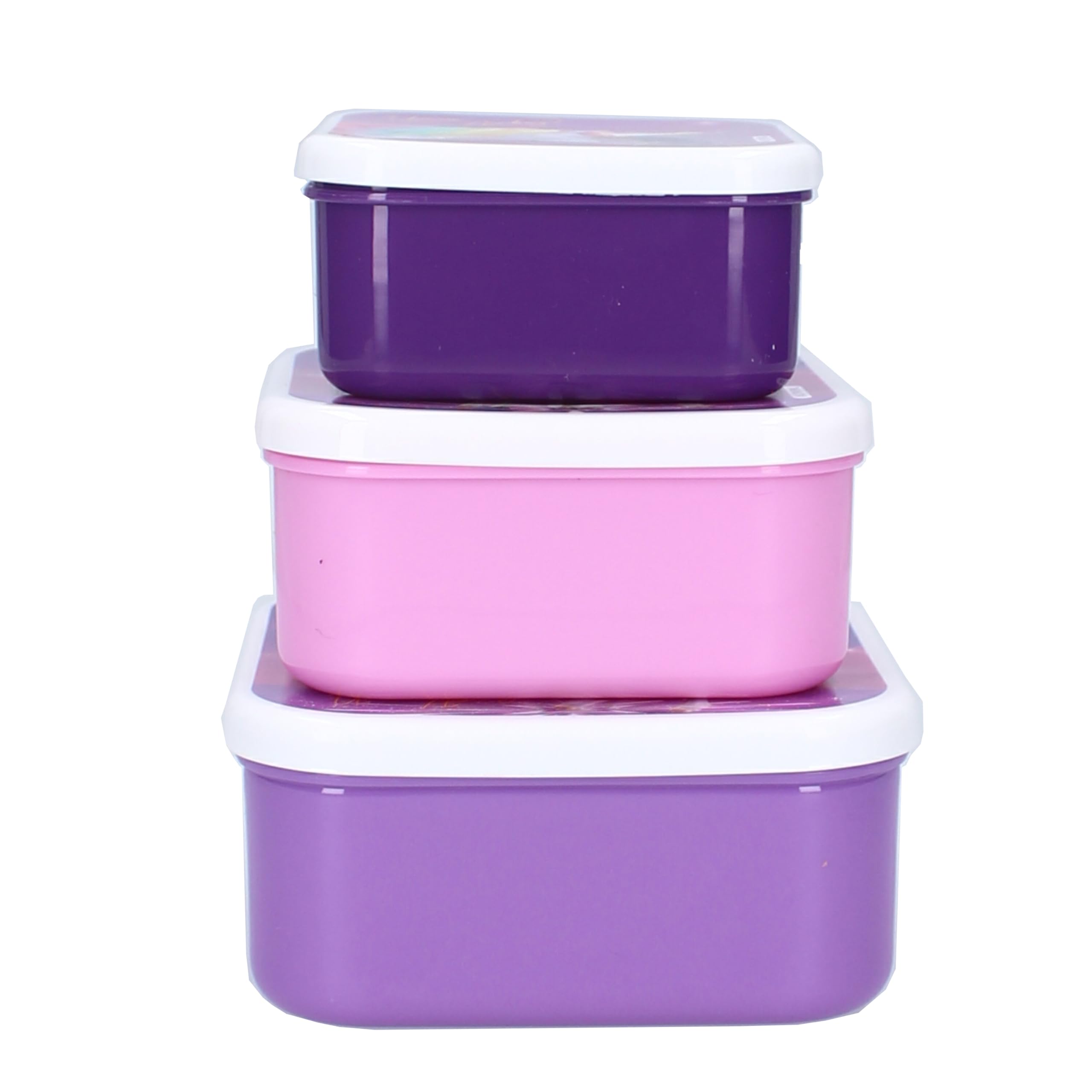Drei praktische Schalen die sich zusammenstecken lassen - super platzsparend! Jede Schale hat nen stabilen Verschluss, damit nix ausläuft. Und die Bilder sind richtig niedlich drauf.