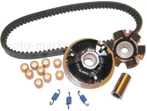 Im Set ist alles enthalten, was du für den Wechsel brauchst: Die komplette Variomatik, 6 Variomatikrollen (18x14mm, 14,6g), Variomatikplatte, Variomatikhülse, 3 Gleitstücke und die Keilriemenscheibe.