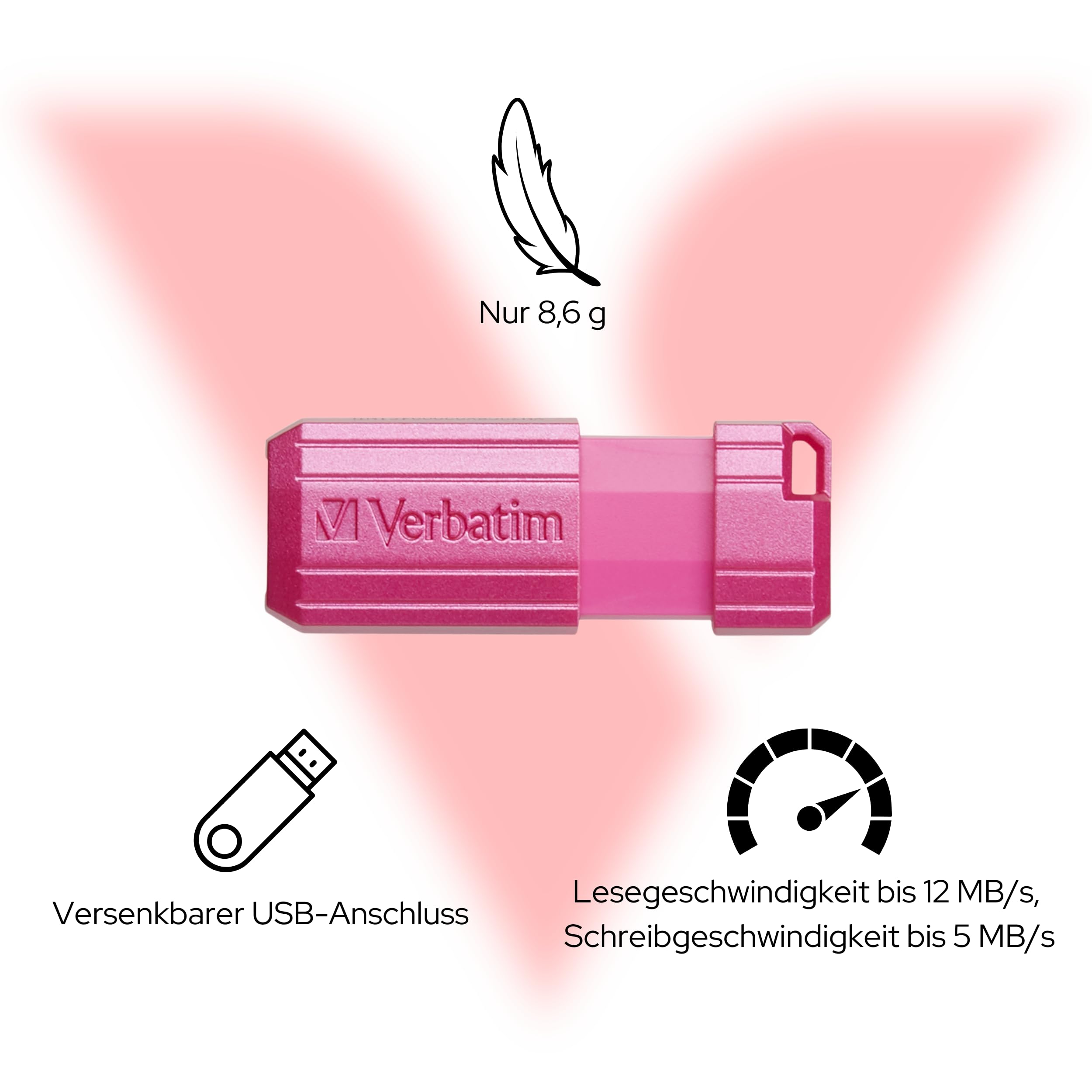 Der Verbatim USB-Stick im coolen PinStripe-Design - 32 GB Speicher, USB 2.0, und dieser praktische Schiebemechanismus schützt den Stecker vor Staub und Beschädigung. Nur 8,6 g leicht - passt in jede Tasche. Lesegeschwindigkeit bis 12 MB/s, Schreiben bis 5 MB/s - für Dokumente, Fotos, Musik völlig ausreichend. Kompatibel mit Windows 7+ und Mac OS X 10.4+. Funktioniert auch an USB 3.2 Anschlüssen. In knalligem Hot Pink - da findest du ihn im Chaos garantiert wieder! Verbatim steht für Qualität - deine Daten sind hier sicher aufgehoben. Perfekt für unterwegs, für's Auto oder als Backup.