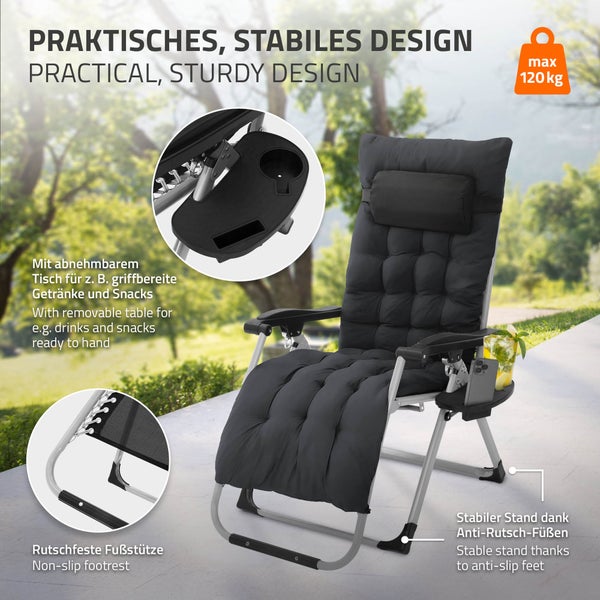Rückenlehne verstellbar von 90° bis 170° - perfekt zum Sitzen, Relaxen oder flach Liegen. Einfach Knopf drücken und Position wählen!