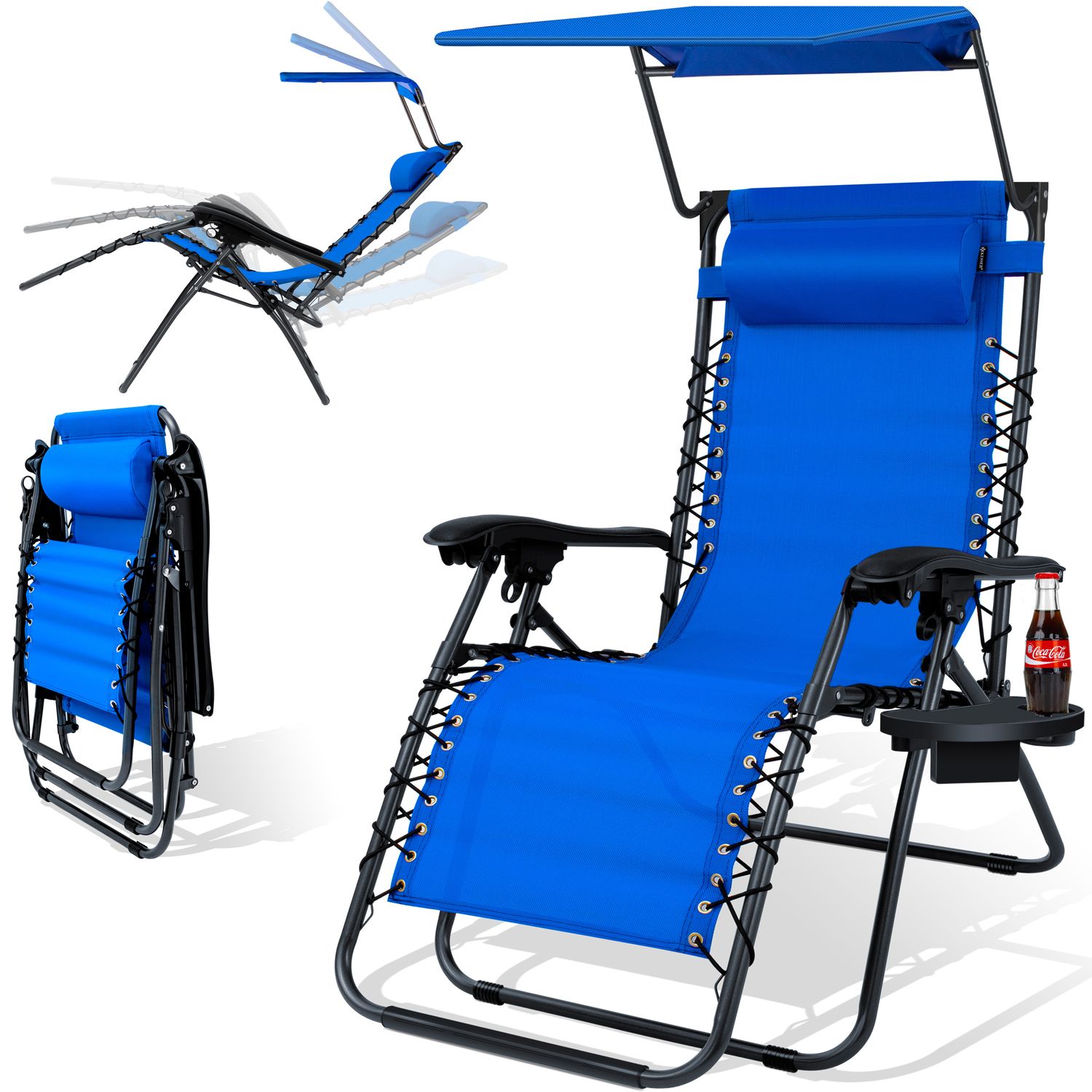 Praktisches Zubehör inklusive: Abnehmbares Nackenkissen, Getränkehalter, Seitentasche und sogar ein Sonnendach.