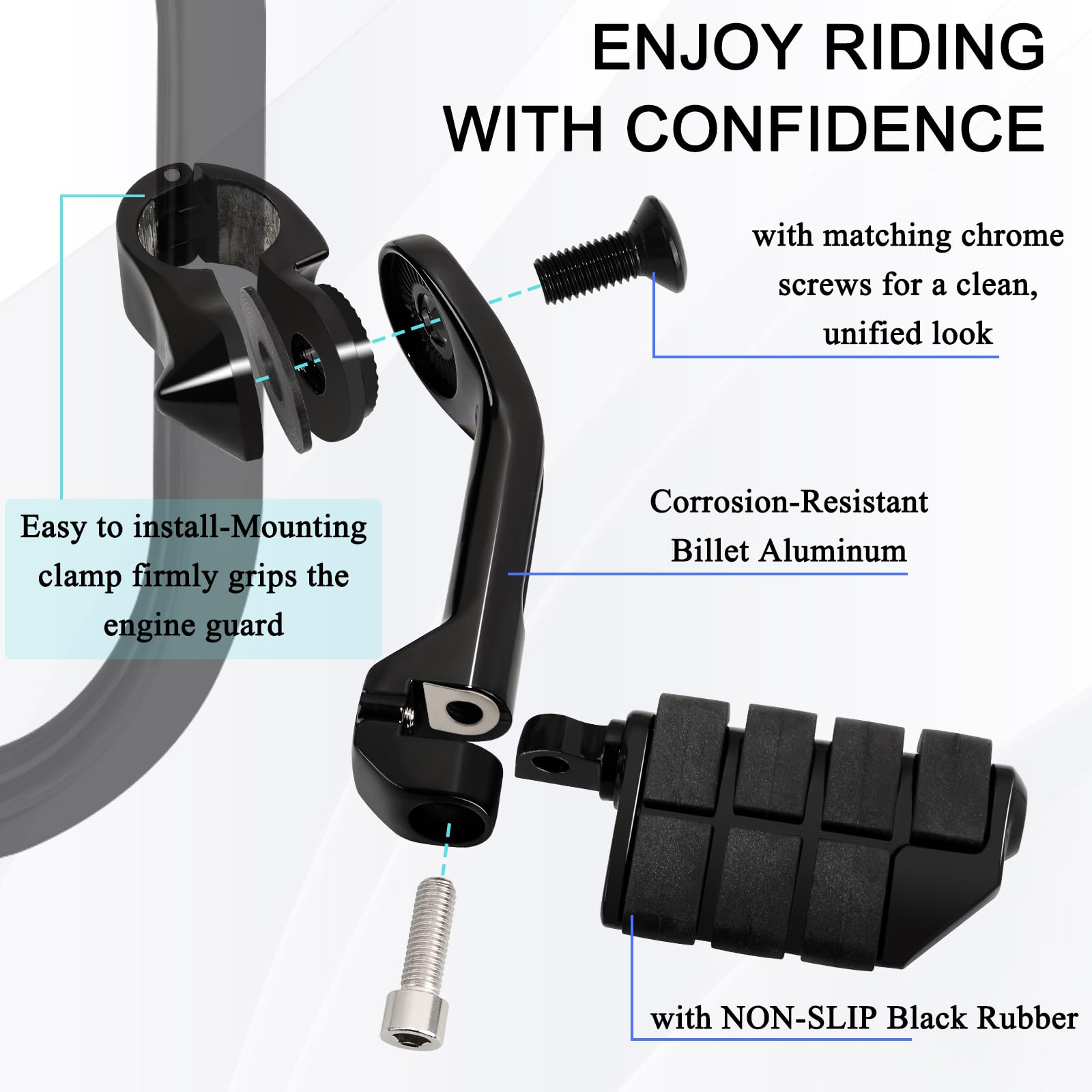 Mach deine Motorrad-Touren bequemer mit diesen verstellbaren Fußrasten! Passen für Harley, Honda, Kawasaki, Suzuki, Yamaha - eigentlich fast alle Bikes mit 3,8cm Motorschutz. Die Dinger sind mega flexibel: 360° drehbar und 90° klappbar! Aus Billet-Aluminium und mit schwarzem Gummigriff - sieht stylisch aus und hält ewig. Einfache Montage mit P-Klemmen, kein Bohren nötig! Perfekt für lange Fahrten, damit deine Füße nicht einschlafen. Für Touring, Softail, Sportster - check vorher dein Modell! Lieferung inklusive linker und rechter Rasten plus allem Montage-Zubehör. Nach nem Jahr Garantie und super Support! Ob City-Ausflug oder Highway-Trip - mit diesen Rasten fährst du entspannter. Verstell sie einfach auf deine perfekte Position und genieße die Fahrt!
