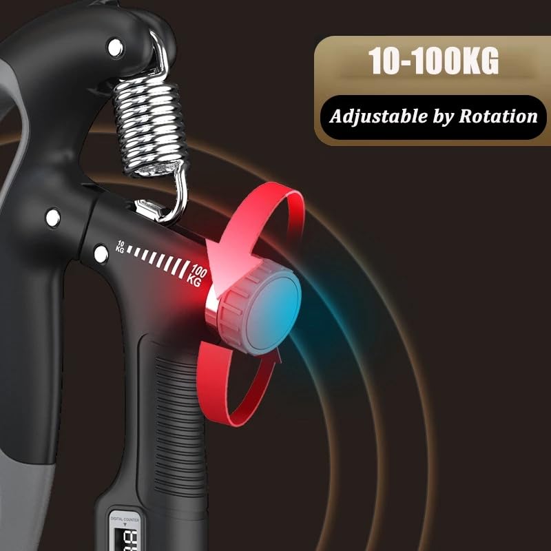 Stärkere Hände und Unterarme - ganz easy! Dieser verstellbare Handgriff-Trainer mit Widerständen von 10-100 kg ist dein perfekter Trainingspartner für zu Hause, im Büro oder unterwegs. 💪\n\nAus robustem PP und Stahl gefertigt, liegt der Trainer angenehm in der Hand und die rutschfeste Oberfläche sorgt für sicheren Halt. Trainiere gezielt Handgelenk, Finger und Unterarme - ideal für Sportler, Musiker oder um einfach im Alltag kräftiger zuzupacken!\n\nDas coole Feature: Der integrierte elektronische Zähler zeichnet deine Trainingszeit und Wiederholungen auf. So behältst du immer den Überblick über deine Fortschritte.\n\nMit 16 cm Länge passt der Trainer in jede Sporttasche und ist in Schwarz, Grün oder Grau erhältlich. Egal ob du Anfänger oder Profi bist - durch den einstellbaren Widerstand findest du immer die passende Herausforderung.\n\nPerfekt für zwischendurch: Wartezeiten, Pausen oder beim Fernsehen werden so zu effektiven Trainingseinheiten. Deine Hände werden es dir danken!