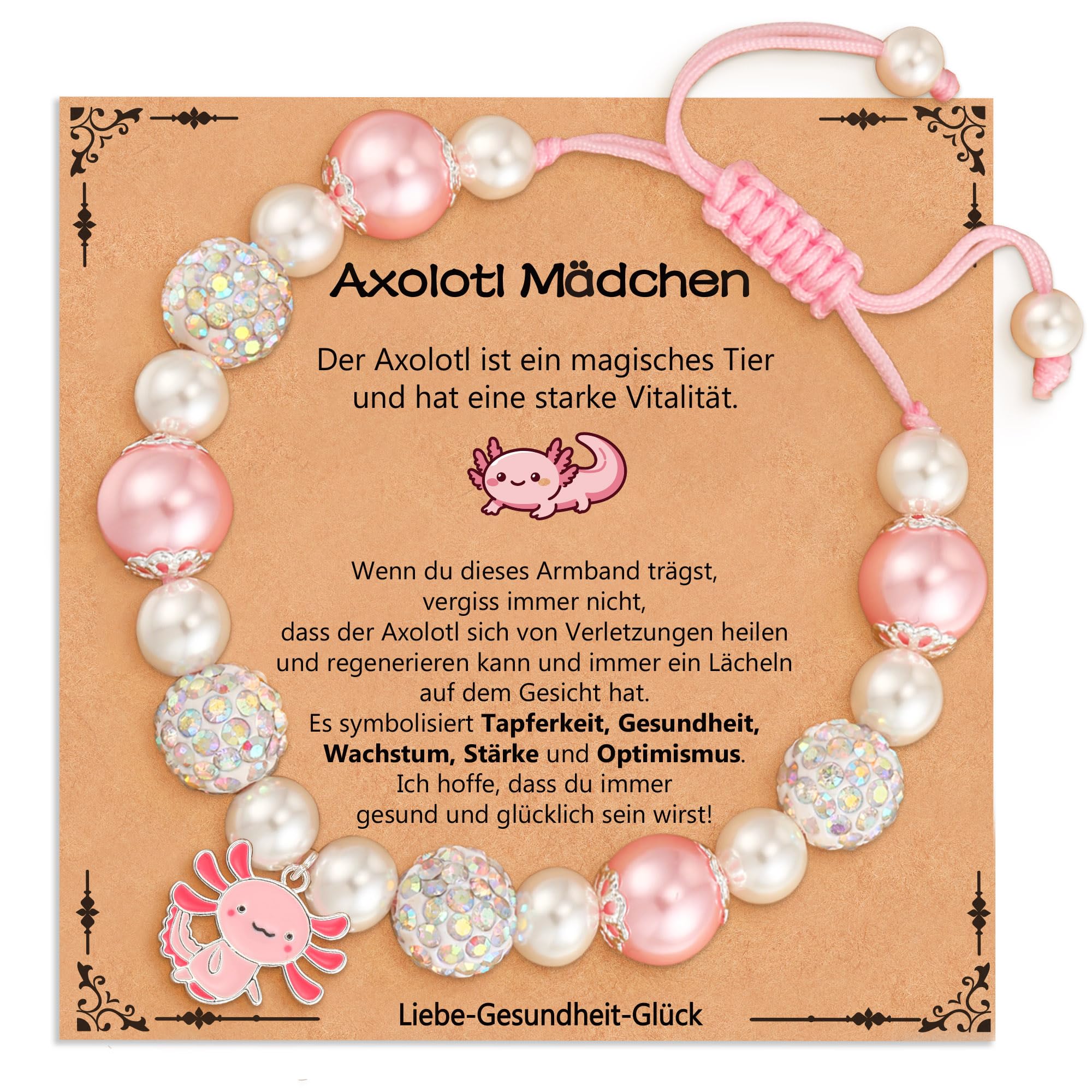Oh wie süß! Dieses Axolotl-Armband ist perfekt für kleine und große Mädchen. Mit einem niedlichen Axolotl-Anhänger und echten Zebrastein-Perlen, verziert mit funkelnden Zirkonen. Das besondere: Es ist verstellbar von 15-25 cm durch verschiebbare Knoten - passt also lange perfekt. Aus Kupfer und geflochtenem Seil, hypoallergen und superleicht. Symbolisiert Widerstandsfähigkeit und Heilung - ein tolles Motivations-Armband! Inklusive personalisierter Grußkarte. Ideal als Geschenk zum Geburtstag, Weihnachten oder einfach so für deine Tochter, Enkelin oder Nichte.
