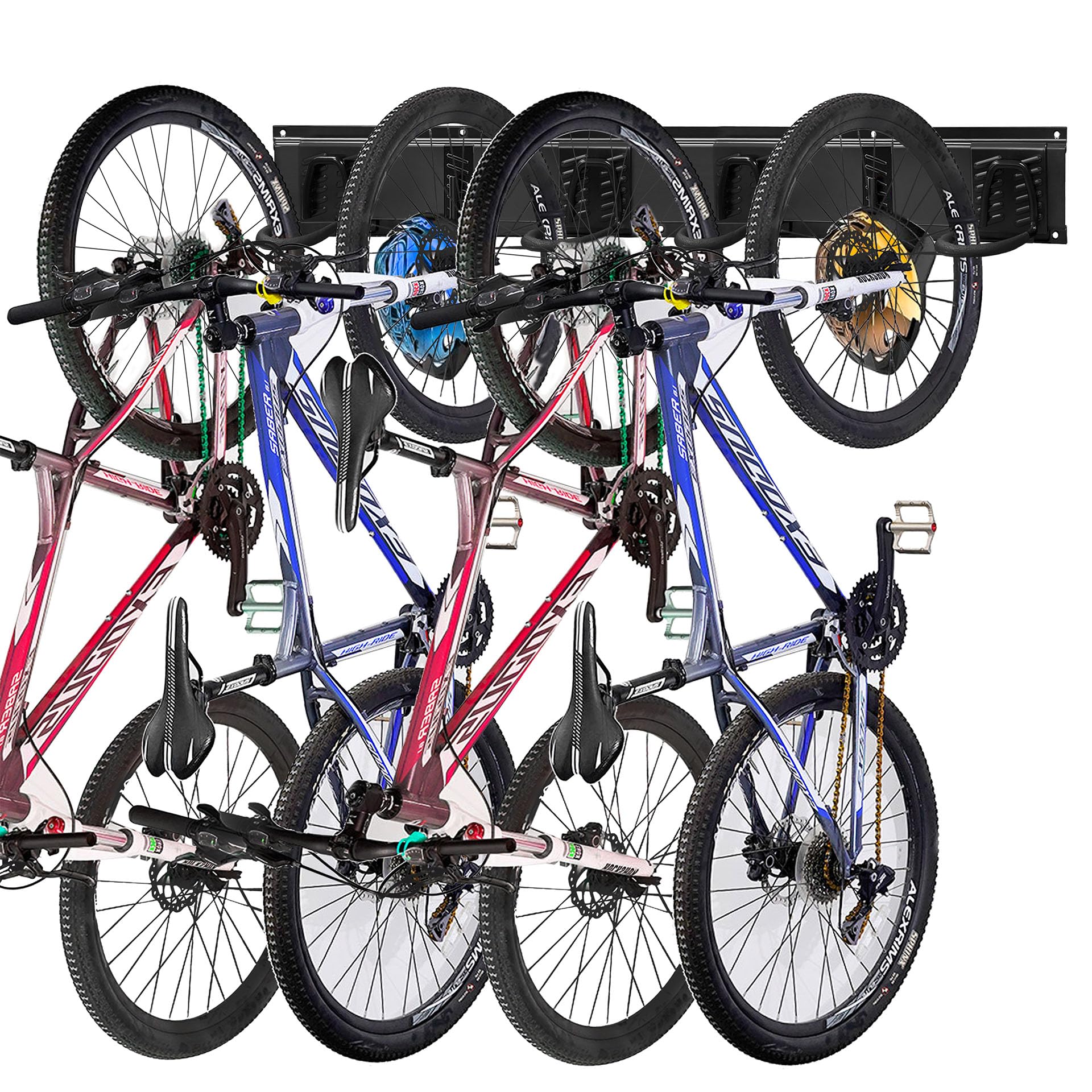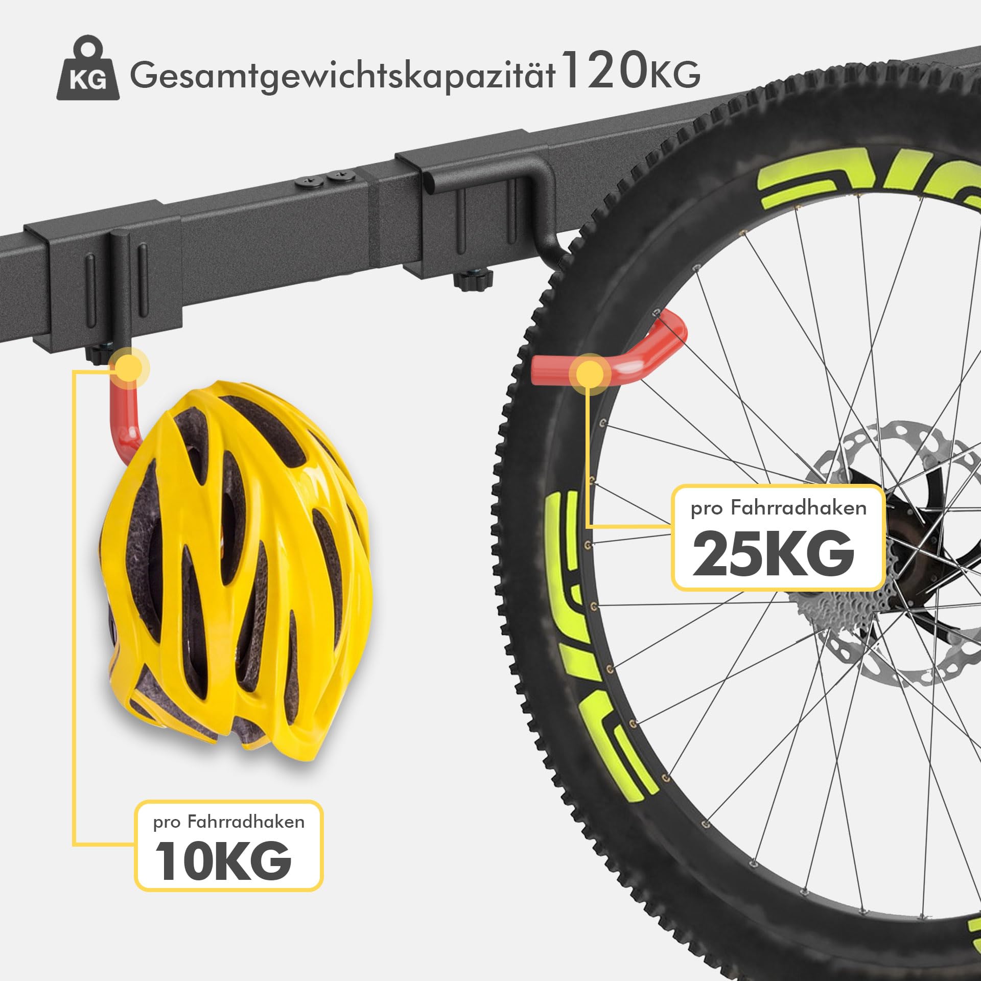 Schluss mit Chaos in Garage und Keller! Die Mimoke Fahrrad-Wandhalterung ist die perfekte Lösung, um deine Räder platzsparend und ordentlich zu verstauen. Das robuste System bietet Platz für bis zu 3 Fahrräder und hält sogar E-Bikes, MTBs und Rennräder mit dicken Reifen sicher. Mit dabei sind praktische Haken für Helme und Zubehör - so ist alles an einem Ort. Die pulverbeschichteten Stahlkomponenten sind absolut unzerstörbar und die gummiummantelten Haken schützen deine Felgen vor Kratzern. Einfache Montage in wenigen Minuten - das nötige Zubehör ist im Lieferumfang enthalten. Ob an Beton-, Ziegel- oder Trockenbauwänden (hier bitte Ständer suchen!) - diese Halterung macht aus jedem Raum einen ordentlichen Fahrradparkplatz. Hol dir deinen Boden zurück und mach Schluss mit umfallenden Rädern!