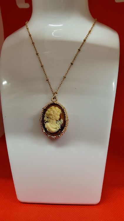 So romantisch und zeitlos! Diese wunderschöne Kamee-Halskette im viktorianischen Stil ist ein absoluter Blickfang. Der ovale Anhänger ist etwa 3,5 cm hoch und 2,5 cm breit und zeigt ein elegantes Reliefprofil in Elfenbein auf himmelblauem Hintergrund. Umrahmt wird das ganze von einer antiken Metallfassung mit zarten Blumenverzierungen - einfach traumhaft! Die Kette ist etwa 45 cm lang und hat einen sicheren Karabinerverschluss. Hergestellt aus hochwertigem Harz und Metall, liegt die Halskette angenehm schwer um den Hals. Perfekt für besondere Anlässe wie Hochzeiten, romantische Dates oder einfach um deinem Alltags-Outfit einen Hauch von Vintage-Charme zu verleihen. Stell dir vor: Du trägst diese Halskette zum weißen Blazer oder zum einfarbigen Kleid - sofort siehst du um Klassen eleganter aus! Auch super als Geschenk für die beste Freundin oder die Mama. Der Retro-Stil ist momentan total angesagt, und mit diesem Schmuckstück bist du garantiert im Trend. Ein Accessoire, das Generationen überdauert und immer modern bleibt - einfach weil es so zeitlos schön ist!