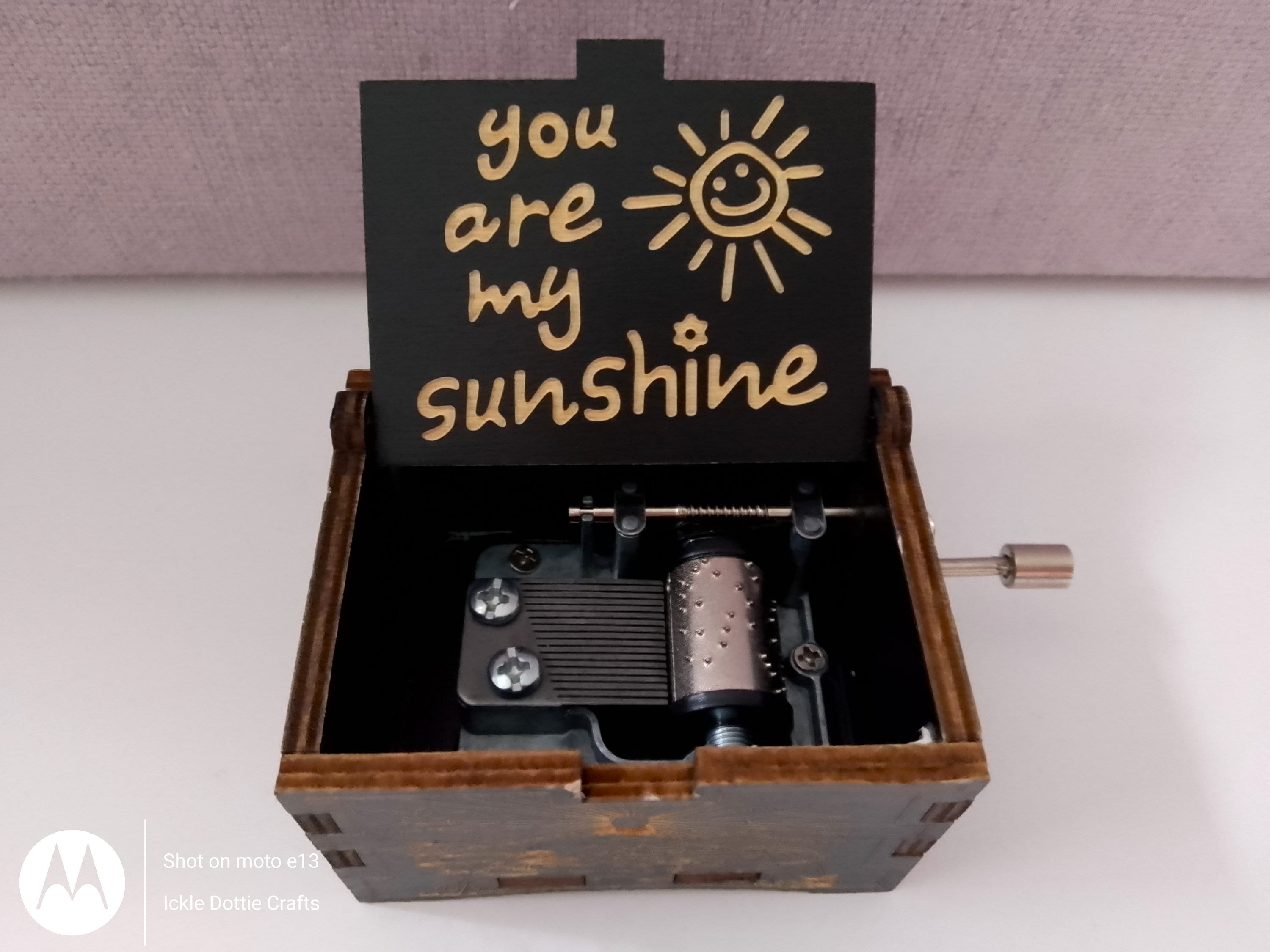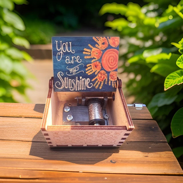 Diese süße Spieluhr aus Birkensperrholz spielt 'You Are My Sunshine'! Einfach an der Handkurbel drehen und die Musik erklingt. Im vintage Stil mit Gravur - ein echter Hingucker. Ideal als Geschenk zur Geburt, Taufe, für die Mama, Oma oder als Deko im Regal. Kompakt, leicht und bringt gute Laune ins Zimmer!