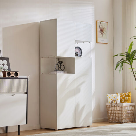 Präsentiere deine Schätze in bestem Licht! Diese elegante Wiuzo Vitrine hat integrierte LED-Beleuchtung in mehreren Farben - perfekt zum Inzenieren deiner Sammlung. Maße: 80x38x170cm, aus weißer Spanplatte mit transparenten Acryl-Seiten. Mit 2 offenen Fächern und Innenregalen hinter Türen. Robuste Konstruktion, Kippsicherung inklusive. Tischplatte trägt 50kg, Schubladen 20kg. Ideal für Wohnzimmer, Büro oder Küche. Einfach aufbauen, Beleuchtung anpassen und deine Lieblingsstücke perfekt in Szene setzen!