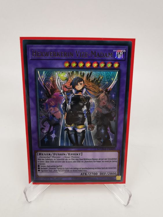 Ein Juwel für Sammler und Spieler! Die Hexwerkerin Vize-Madam in Ultra Rare aus Magnificent Mavens - deutsch, 1. Auflage, in Near Mint Zustand. Ein offizielles Konami-Lizenzprodukt für echte Yugioh-Fans.\\n\\nAls Effekt Fusionsmonster bietet sie mächtige Optionen: Zerstöre Spielfeldkarten, beschwöre Hexwerker-Monster oder füge deiner Hand Hexwerker-Zauber/Fallen hinzu. Ein Game-Changer in jedem Deck!\\n\\nIm Lieferumfang enthalten: Das exklusive RC-Fieldcenter für perfekte Spielfeldorganisation bei Turnieren. Professionelle Hilfe für ernsthafte Duelle!\\n\\nSicher verpackt in knicksicherer Spezialverpackung, damit die Karte unbeschadet bei dir ankommt. Nachhaltiger Versand schont Ressourcen.\\n\\nVon erfahrenen Händlern seit 2018 - Qualität und Expertise, die du vertrauen kannst. Erweitere deine Sammlung mit diesem begehrten Sammlerstück!