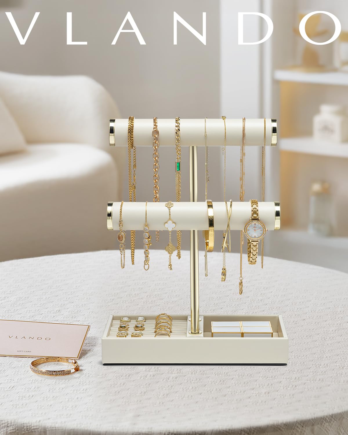 Endlich Ordnung im Schmuckkästchen! Dieser 2-stöckige Schmuckständer von Vlando ist der absolute Game-Changer für deine Schmucksammlung. Oben Platz für 16-24 Halsketten und Armbänder, unten ein praktisches Tablett für Ringe, Ohrringe und anderes Kleinteil. Im eleganten Beige mit Gold-Akzenten - sieht total edel aus! Aus hochwertigem Leder und Metall - super stabil und langlebig. Einfach zusammenschrauben (Montage in Sekunden) und schon hast du deinen Schmuck immer perfekt sortiert und griffbereit. Ein tolles Geschenk für alle die Wert auf Ordnung und Stil legen!