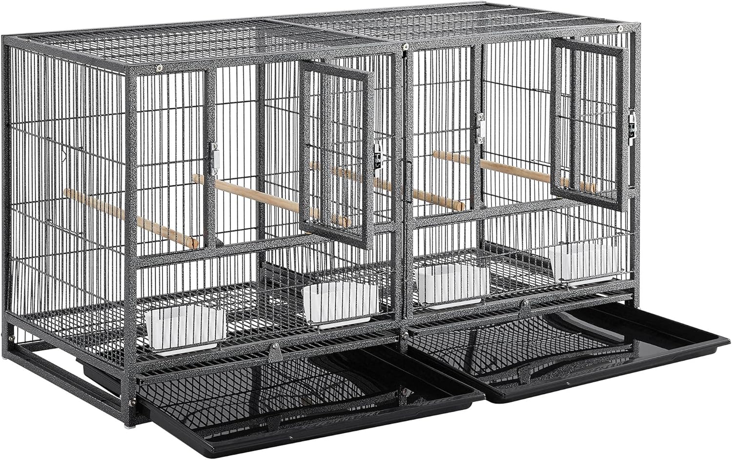 Ein tolles Zuhause für deine gefiederten Freunde! Dieser Vogelkäfig in Weiß mit den Maßen 60x26x39,5 cm bietet viel Platz für kleine und mittlere Vögel. Mit zwei Türen und praktischer Trennwand - super für die Zucht oder um Vögel zu trennen. Aus kohlenstoffarmem Stahl und ABS-Kunststoff ist er robust und sicher. Die zwei ABS-Futterschalen sind praktisch für verschiedene Futterarten. Zwei Holzstangen bieten natürliche Sitzmöglichkeiten. Der schiebbare Kunststoffboden macht die Reinigung super einfach - einfach rausziehen und saubermachen. Mit praktischem Tragegriff ideal als Transportkäfig für Reisen oder Tierarztbesuche. Das Schiebefenster ermöglicht leichten Zugang. Einfach eine komplette Voliere, die alles bietet, was Vögel brauchen. Ob für Papageien, Wellensittiche oder andere Vögel - hier fühlen sie sich wohl. Damit hast du ein sicheres und schönes Zuhause für deine Vögel, das auch noch gut aussieht!