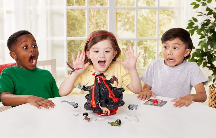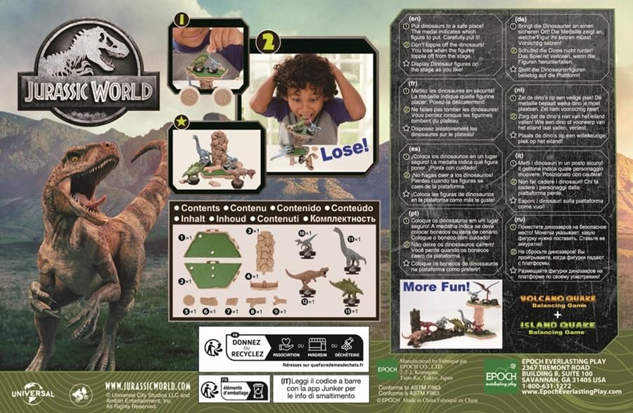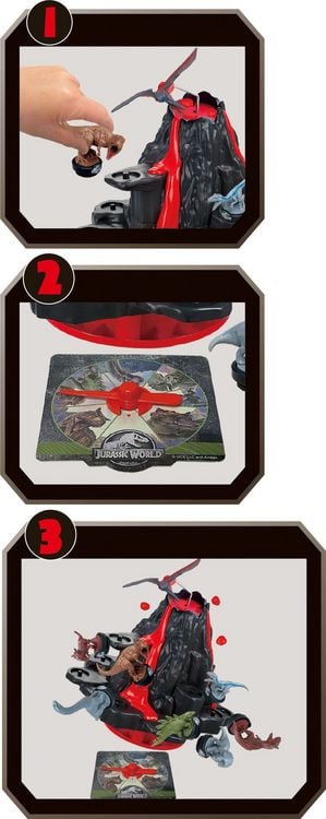Vorsicht, der Vulkan bricht aus! Dieses super spannende Geschicklichkeitsspiel für 2-4 Spieler bringt Action ins Kinderzimmer. Mit 8 echten Jurassic World Dinosaurier-Figuren. Einfach die Drehscheibe drehen und die Dinos auf den Vulkan setzen. Aber pass auf - wenn der Flugsaurier zu stark wackelt, fallen alle Dinos runter! Für Kinder ab 4 Jahren, auch Erwachsene haben Spaß. Perfekt für Spielenachmittage mit Familie und Freunden. Fördert Geschicklichkeit und Konzentration. Macht einfach irre viel Spaß - da werden Kinderträume wahr!