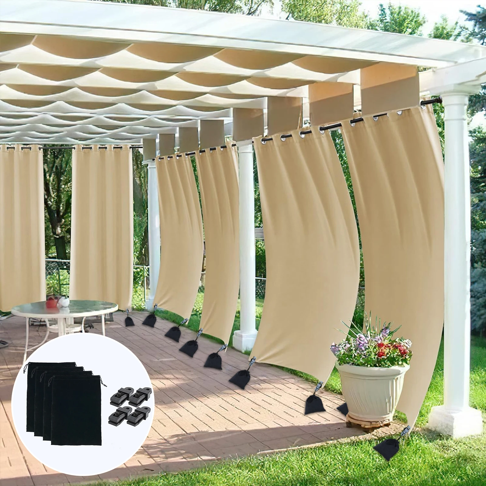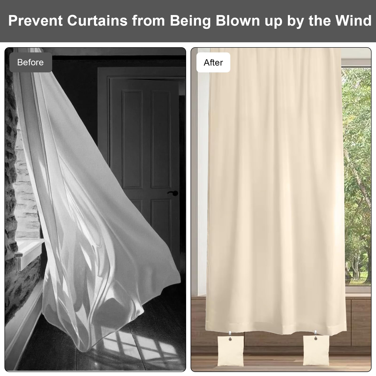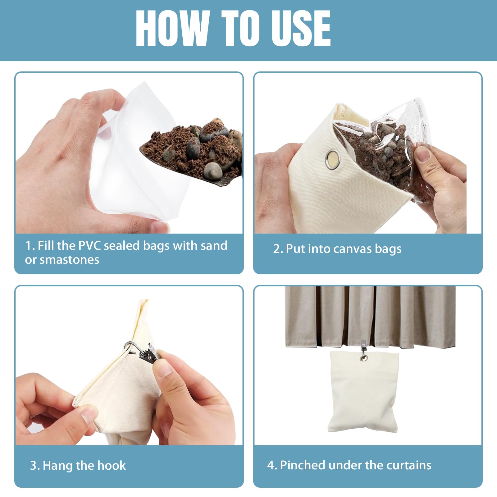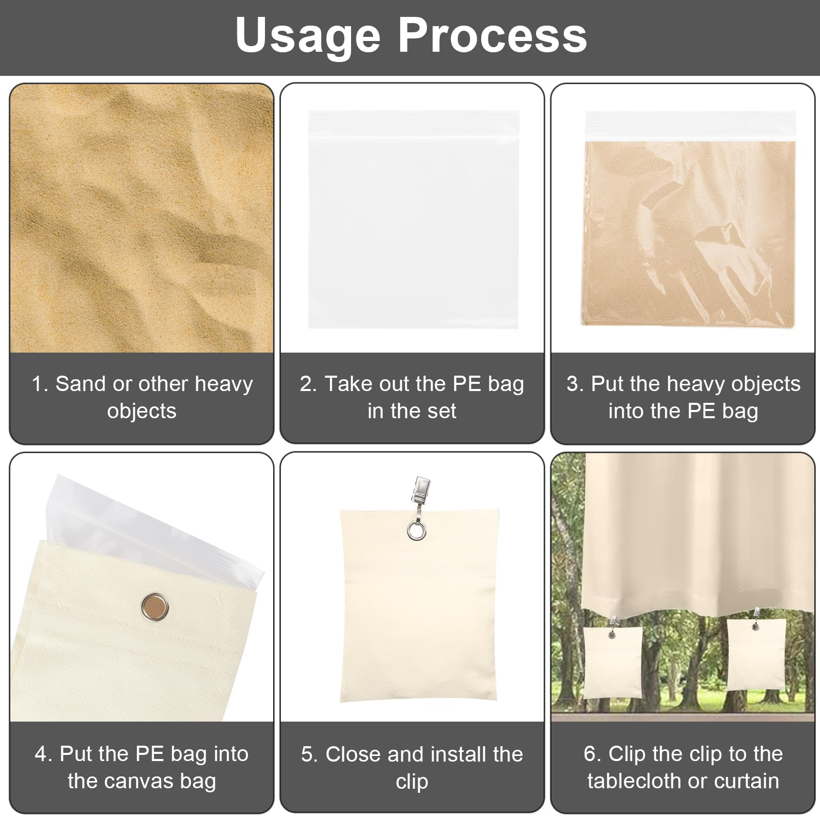 Halte deine Outdoor-Vorhänge da, wo sie hingehören! Diese praktischen Gewichtstaschen sorgen dafür, dass deine Terrassen-Vorhänge auch bei starkem Wind nicht wild herumflattern. \\n\\nIm 6er-Set bekommst du alles, was du brauchst:\\n• 6x stabile Segeltuchtaschen - aus hochwertigem Canvas-Gewebe\\n• 6x transparente PE-Verschlussbeutel - absolut dicht und auslaufsicher\\n• 6x Metallclips - rostfrei und mit fester Klemmkraft\\n\\nSo einfach funktioniert's:\\n1. PE-Beutel mit Sand, Kies oder Wasser füllen\\n2. Beutel in die Segeltuchtasche stecken\\n3. Selbstklebenden Verschluss schließen\\n4. Metallclip am Vorhang befestigen - fertig!\\n\\nDie Gewichte sind super vielseitig einsetzbar:\\n• Für Gartenpavillon-Vorhänge und Markisen\\n• Zum Beschweren von Tischdecken beim Picknick\\n• Für Zeltvorhänge beim Camping\\n• Für Sonnenschirm-Abdeckungen\\n• Für Standvorhänge auf Märkten\\n\\nDas robuste Canvas-Material hält auch bei schlechtem Wetter problemlos stand. Die Metallclips beißen sich fest in den Stoff und rutschen nicht ab. Durch den selbstklebenden Verschluss bleibt der Füllinhalt sicher an Ort und Stelle. \\n\\nPerfekt für alle, die ihre Outdoor-Einrichtung vor dem Wind schützen wollen. Einfach, effektiv und wiederverwendbar - so macht Gartenparty Spaß!