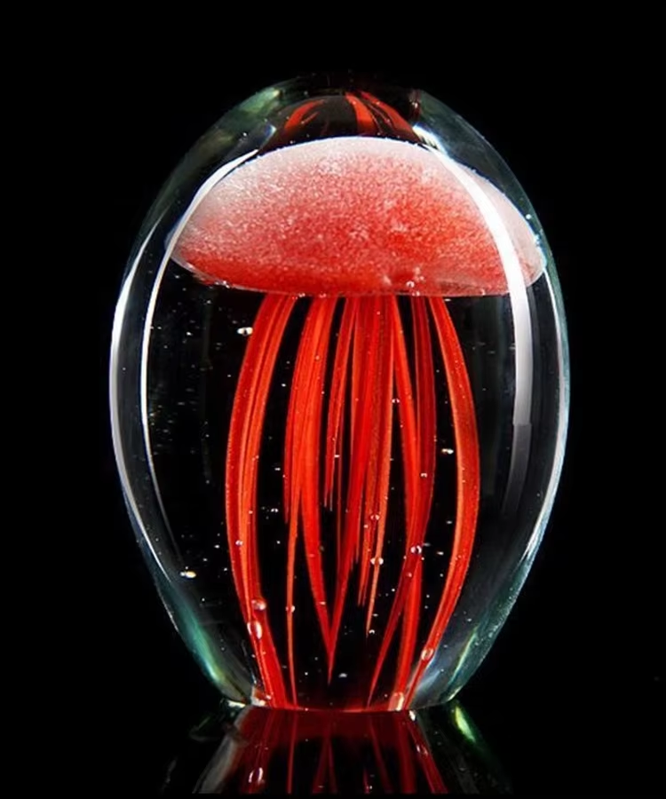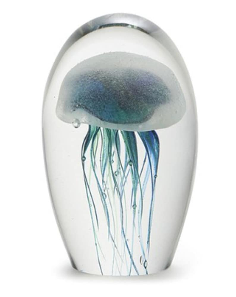Wie faszinierend sind denn diese Glasquallen! Jedes Stück ist mundgeblasen und handgefärbt - das macht sie zu einem echten Unikat. Inspiriert von echten Quallen aus dem Ozean, fangen sie die Anmut der Meeresbewohner perfekt ein. Die kleinen Luftblasen im Kristallglas geben dem Ganzen noch mehr Tiefe und machen es zu einem richtigen Hingucker. Ob im Wohnzimmer, Schlafzimmer oder Büro - diese Deko-Stücke verwandeln jeden Raum in eine kleine Unterwasserwelt. Perfekt als Briefbeschwerer oder einfach als stylische Deko. Auch ein super Geschenk für alle die das Meer lieben! Einfach hinstellen und sich an der magischen Ausstrahlung erfreuen - damit holst du dir ein Stück Ozean nach Hause!