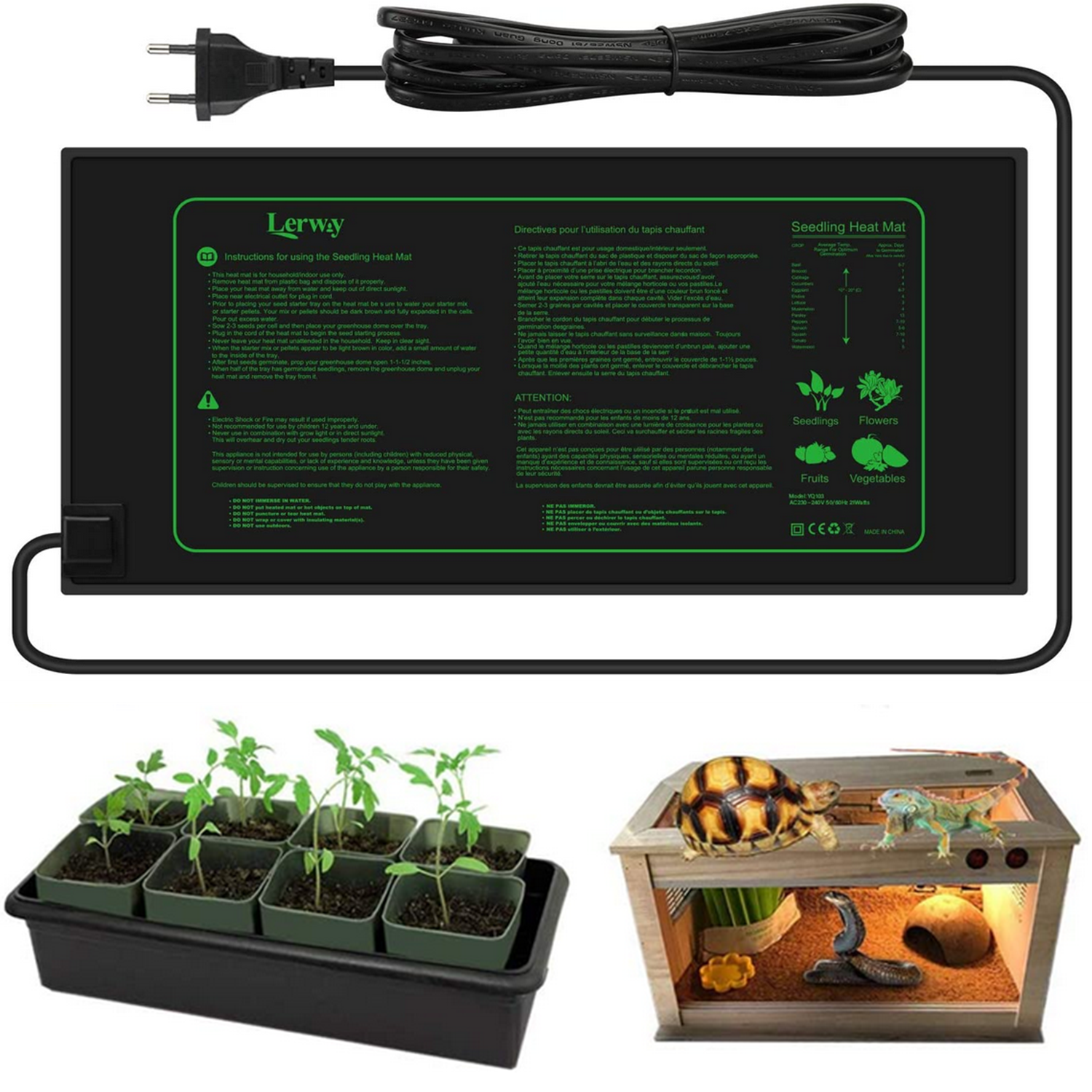 Hey, diese Heizmatte ist echt praktisch! Mit ihren 50 Watt und 52,5 x 25 cm Größe wärmt sie super gleichmäßig - perfekt für deine Sämlinge im Zimmergewächshaus. Das coole Feature: Der Thermostat lässt sich in 1°C-Schritten zwischen 20-45°C genau einstellen. Macht sich aber nicht nur gut für Pflanzen, sondern auch für Haustiere wie Reptilien. Ist aus robustem PVC, hält ewig und ist wasserdicht. Die Wärme verteilt sich super gleichmäßig durch die qualitativen Heizdrähte. Übrigens: Sie erhöht die Bodentemperatur um ca. 5-10°C - das fördert das Wurzelwachstum deiner Pflanzen richtig gut! Auch bei kaltem Wetter ein absoluter Game-Changer. Und wusstest du, dass du sie auch für andere Sachen nutzen kannst? Wie wär's mit Joghurt-Herstellung oder als Wärmequelle für deine Haustiere? Einfach ein Allround-Talent für alle, die's warm mögen! Das Paket kommt komplett mit der Heizmatte und Thermostat - alles was du brauchst. Falls mal was nicht passt, hilft der Kundenservice super schnell weiter. Echt empfehlenswert für alle Hobby-Gärtner und Tierfreunde!