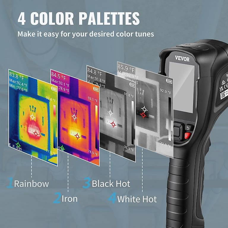 15 verschiedene Farbpaletten stehen zur Auswahl - von White Hot über Regenbogen bis Iron Red. So kannst du das Bild optimal an deine Bedürfnisse anpassen. Der integrierte Temperaturalarm warnt dich automatisch bei Auffälligkeiten.
