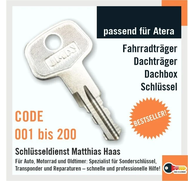 Hast du deinen Schlüssel für die Dachbox oder den Fahrradträger verloren? Der bayesen Ersatzschlüssel WD105 ist die Lösung! Kompatibel mit Thule, BMW, Audi, VW, Skoda, Ford und vielen mehr. Einfach den Code an deinem Schloss prüfen (WD001-WD250) und bei Übereinstimmung passt er perfekt. Aus robustem Metall gefertigt für lange Haltbarkeit. Ideal als Zweitschlüssel oder Ersatz bei Verlust. Spart teure Neuanfertigungen! Perfekt für alle, die viel unterwegs sind und ihre Ausrüstung sicher verschließen wollen. Einfach bestellen und sofort nutzen - ohne Wartezeit!