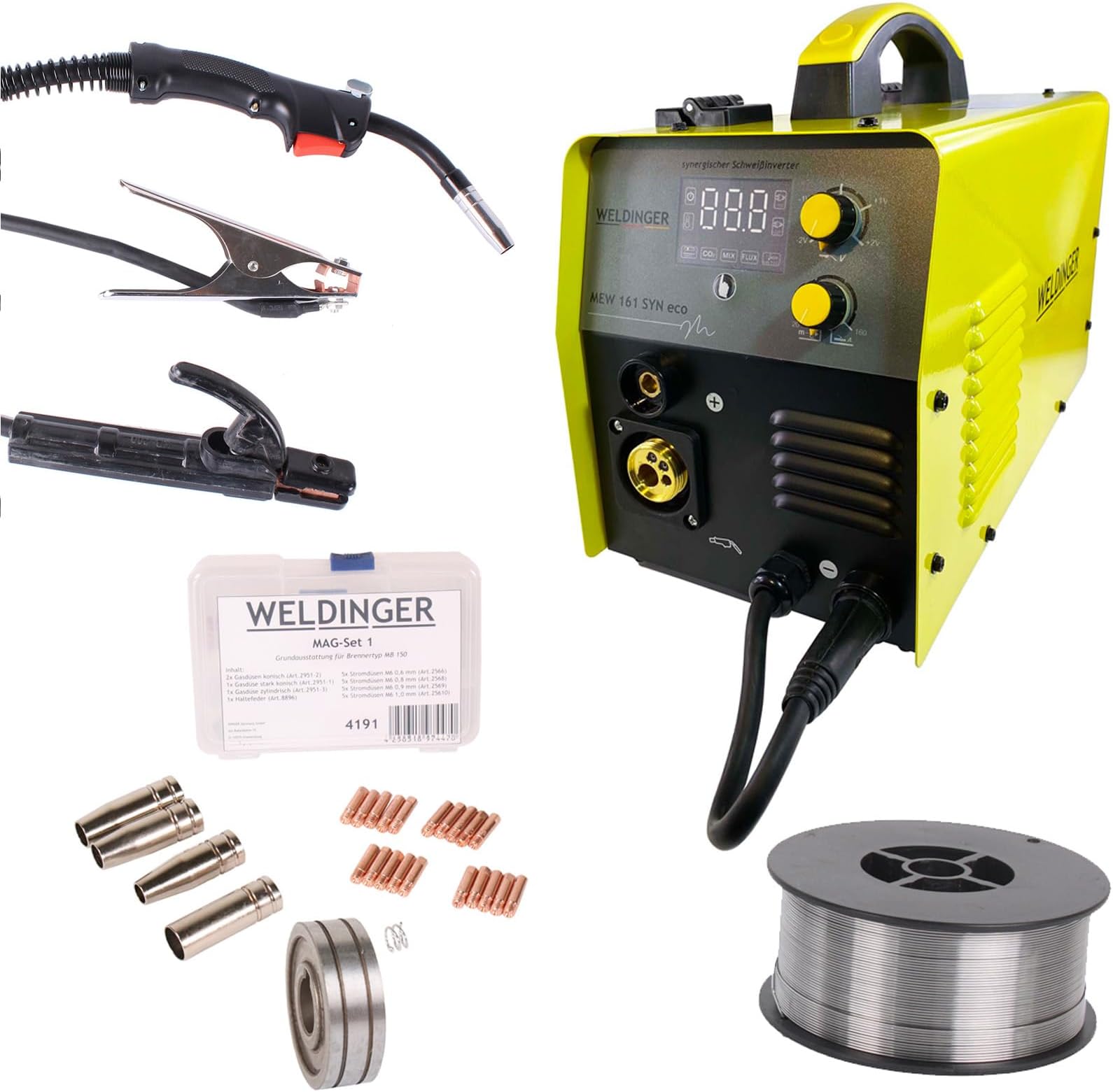 Perfekter Einstieg ins Schweißen! Der WELDINGER MEW 161 SYN eco ist ein echter Alleskönner - MIG/MAG, Elektrode und sogar WIG schweißen sind möglich. Mit 160A maximalem Schweißstrom meisterst du Stahl, Edelstahl und verzinkte Materialien bis 4mm Dicke. Das Set hat alles dabei: MAG-Set 1 mit Verschleißteilen, 1kg Fülldraht 0,8mm und 3m Schlauchpaket. IGBT-Invertertechnologie sorgt für stabilen Lichtbogen und einfache Bedienung. Microprozessorgesteuert mit synergischem Drahtvorschub - einfach die Materialstärke einstellen und los geht's! Ideal für Hobby-Schrauber, Garten und Werkstatt. Lüfterkühlung für lange Schweißzeiten. Hot-Start und Antistick-Funktion machen das Schweißen einfach. Eurozentralanschluss für schnellen Schlauchwechsel. Einsteiger-freundlich und trotzdem professionell - damit wird Schweißen zum Kinderspiel!