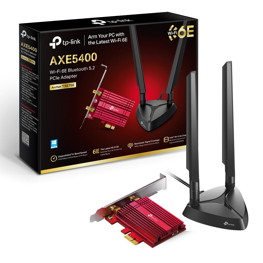 Rüste deinen Desktop-PC mit modernster WiFi 6E Technologie auf! Die TP-Link Archer TXE72E WLAN-Karte bringt ultraschnelles Internet mit bis zu 2,4 Gbit/s auf deinen Rechner. Perfekt für Gamer: extrem niedrige Latenz, unterbrechungsfreie Verbindung und die Power, um das volle Potential deines WiFi 6E Routers auszuschöpfen. Mit zwei starken Antennen für exzellenten Empfang und Bluetooth 5.3 für alle deine Peripheriegeräte. Einfach in den PCIe-Slot stecken, Antennen anschließen und schon surfst du im schnellsten WLAN. WPA3-Sicherheit schützt dein Netzwerk vor Hackern. Inklusive 2 Jahre Garantie - upgrade deinen PC für das nächste Level an Gaming und Streaming!