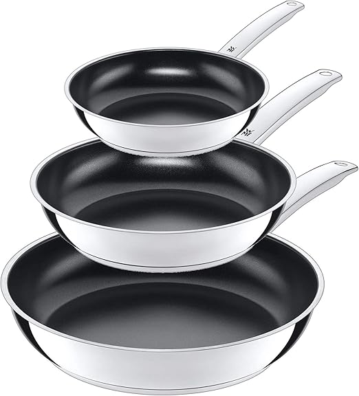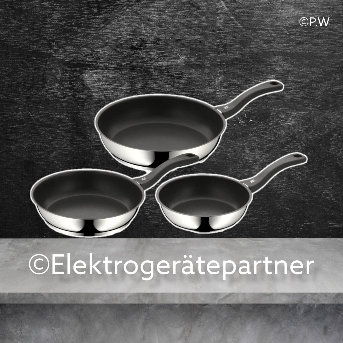 Küchen-Revolution gefällig? Das WMF Click&Serve Set macht Kochen, Servieren und Aufbewahren super einfach! Enthalten sind 2 beschichtete Bratpfannen (24 cm und 28 cm) plus ein abnehmbarer Griff. Der geniale Griff rastet an jeder Stelle des Randes ein und hält satte 10 kg aus - perfekt zum platzsparenden Stapeln! Vom Herd direkt in den Backofen (bis 260°C hitzebeständig) und dann auf den Tisch - ohne umfüllen! Die Cromargan Edelstahl-Pfannen haben eine kratzfeste Antihaftbeschichtung für fettarmes Braten ohne Anbrennen. Der TransTherm-Allherdboden funktioniert auf ALLEN Herdarten - Induktion, Gas, Elektro, Glaskeramik. Durch die spezielle Wölbung steht die Pfanne beim Erhitzen absolut eben auf dem Kochfeld. Der breite Schüttrand gießt tropffrei ab - kein Kleckern mehr! Die Pfannen und Deckel (separat erhältlich) sind spülmaschinenfest, nur der Griff sollte per Hand gereinigt werden. Ideal für kleine Küchen oder alle, die praktisch und stylisch kochen wollen. Mit WMF Qualität, die lange hält - ein Investment, das sich jeden Tag aufs Neue lohnt. Endlich mehr Platz in der Küche und weniger Abwasch!