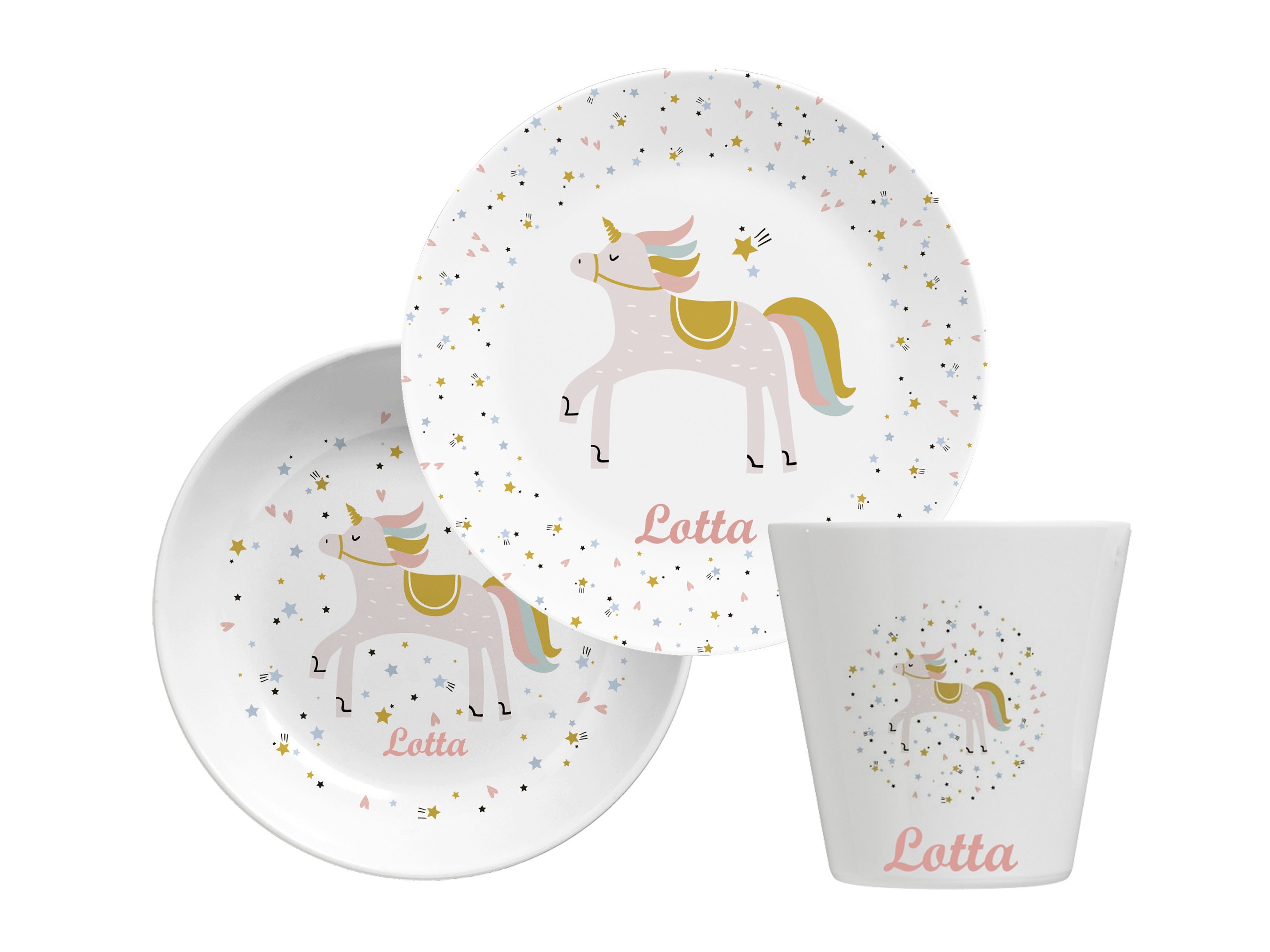Oh, wie süß ist denn dieses Einhorn-Geschirrset von WMF!? Das 6-teilige Set enthält alles: Messer, Löffel, Gabel, kleinen Löffel, Teller und Müslischale - perfekt für die ersten eigenen Essversuche! Aus Cromargan Edelstahl 18/10 - rostfrei, geschmacksneutral und spülmaschinengeeignet! Das bunte Einhorn-Design lässt Kinderaugen strahlen! Und das Beste: Du kannst alle Teile mit Namen gravieren lassen - ein echt persönliches Geschenk! Das Besteck ist ergonomisch für kleine Hände - liegt perfekt und ist leicht zu halten! Das Messer hat einen leichten Wellenschliff - schneidet, aber ist nicht gefährlich! Perfekt als Geschenk zur Taufe, Geburt oder zum Geburtstag - etwas ganz Besonderes das lange hält! Die Motive sind lebensmittelecht und kratzfest - auch nach oftem Spülen noch schön! In hübscher Geschenkverpackung - gleich zum Verschenken bereit! Dein Kleines wird sich wie eine richtige Prinzessin fühlen - und das Essen lernen macht mit diesem niedlichen Set gleich doppelt so viel Spaß! Einfach unvergesslich!
