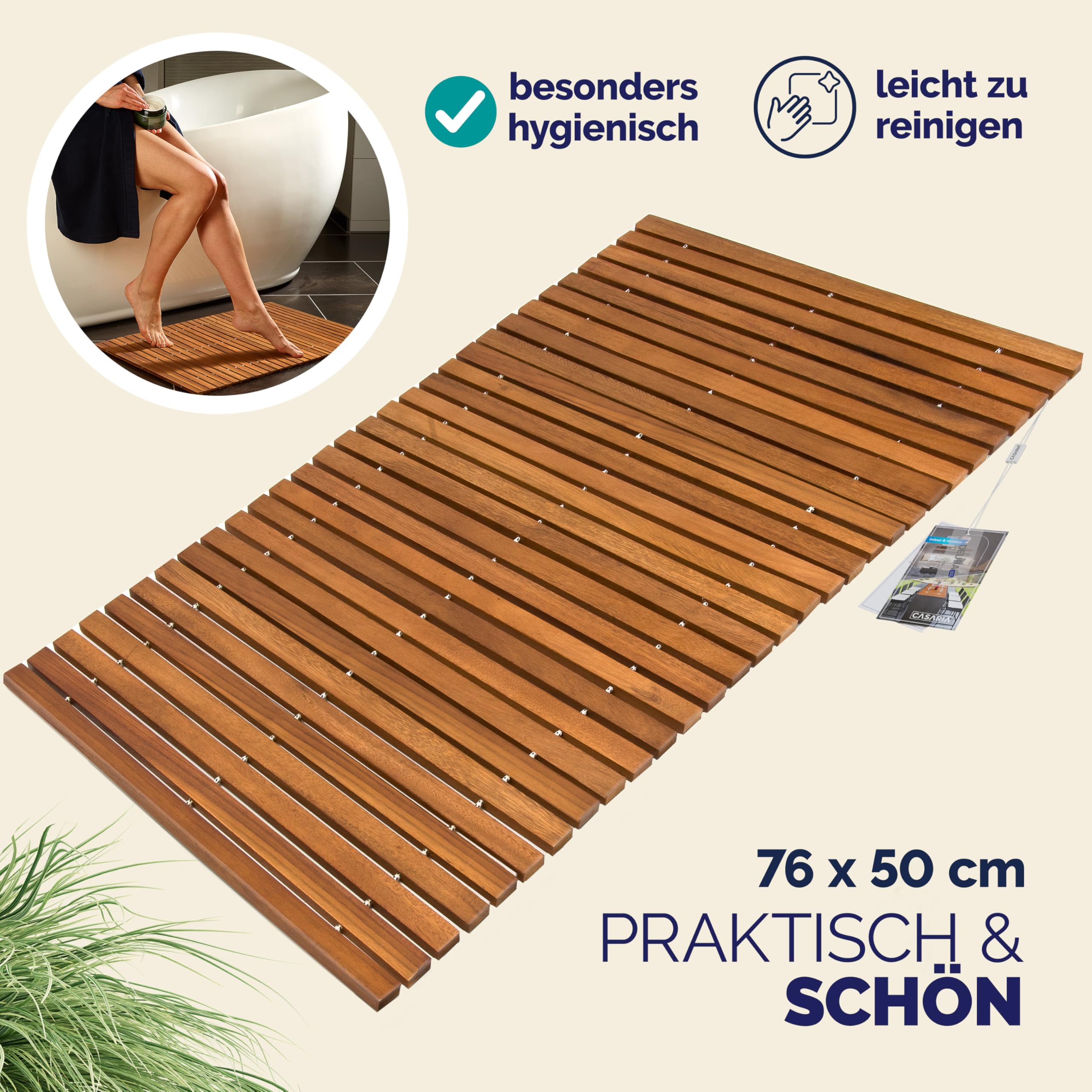 Bring natürlichen Stil in dein Badezimmer! Diese Bambus-Badematte von WRQIOO ist nicht nur super schick, sondern auch mega praktisch. Mit 50x100cm Größe bietet sie genug Platz und sieht total modern aus. Aus natürlichem Bambus gefertigt, ist sie extrem robust und langlebig. Die rutschfeste Unterseite sorgt für sicheren Stand - kein Rutschen auf nassem Boden! Besonders praktisch: Sie ist wasser- und feuchtigkeitsresistent, leicht zu reinigen (einfach mit Wasser abspülen) und korrosionsbeständig. Die Oberfläche ist glatt poliert, die Ecken abgerundet - keine Verletzungsgefahr! Nicht nur fürs Badezimmer super, sondern auch für Sauna, Fitnesscenter oder sogar als Schuhregal. Die natürliche Holzfarbe passt zu jedem Einrichtungsstil. Einfach ausrollen und sich über die tolle Qualität freuen - deine Füße werden's lieben!