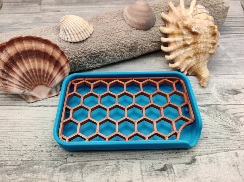 Schluss mit matschiger Seife! Diese coole 3D-gedruckte Seifenschale mit praktischem Wabeneinsatz hält deine Seife immer trocken und sauber. Der herausnehmbare Einsatz lässt Wasser einfach ablaufen - deine Seife hält viel länger! Im modernen minimalistischen Design in Schwarz mit weißem Einsatz - passt in jedes Badezimmer. Aus robustem PLA+ und PETG-Kunststoff gefertigt - langlebig und stabil. Mit ca. 11x8x3cm genau die richtige Größe für feste Seifen, Shampoos oder Spülmittel. Einfach zu reinigen - Einsatz rausnehmen und unter Wasser abspülen. Hergestellt in Deutschland mit Liebe zum Detail - Qualität die man sieht! Nachhaltig produziert und plastikfrei verpackt. Perfekt fürs Badezimmer, die Gästetoilette oder die Küche. Mach deine Seifenecke ordentlich und stylisch - ganz ohne lästiges Aufwischen. Einfach hinstellen und sich über trockene Seife freuen!