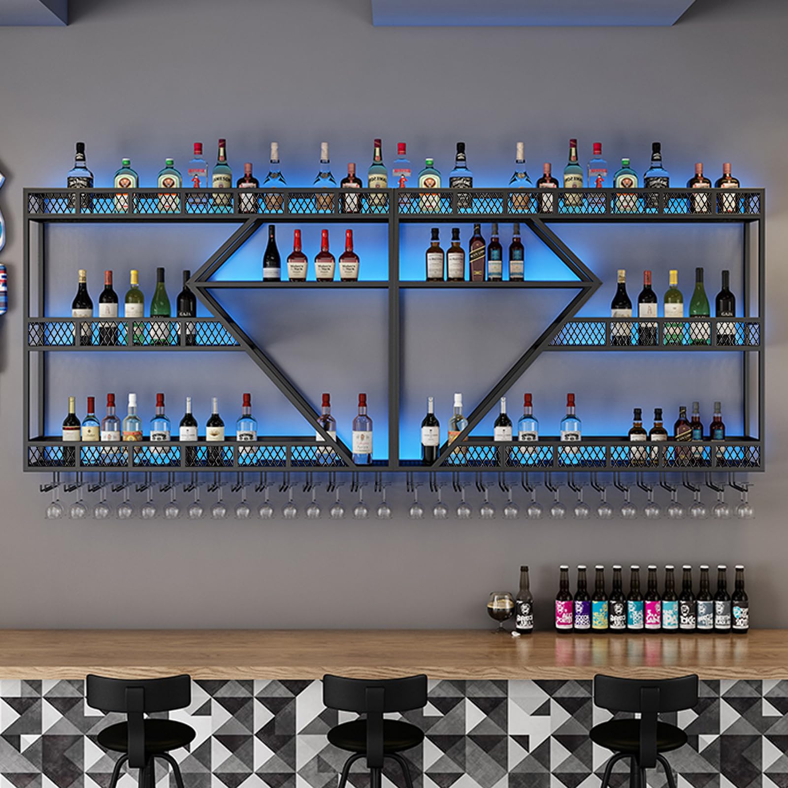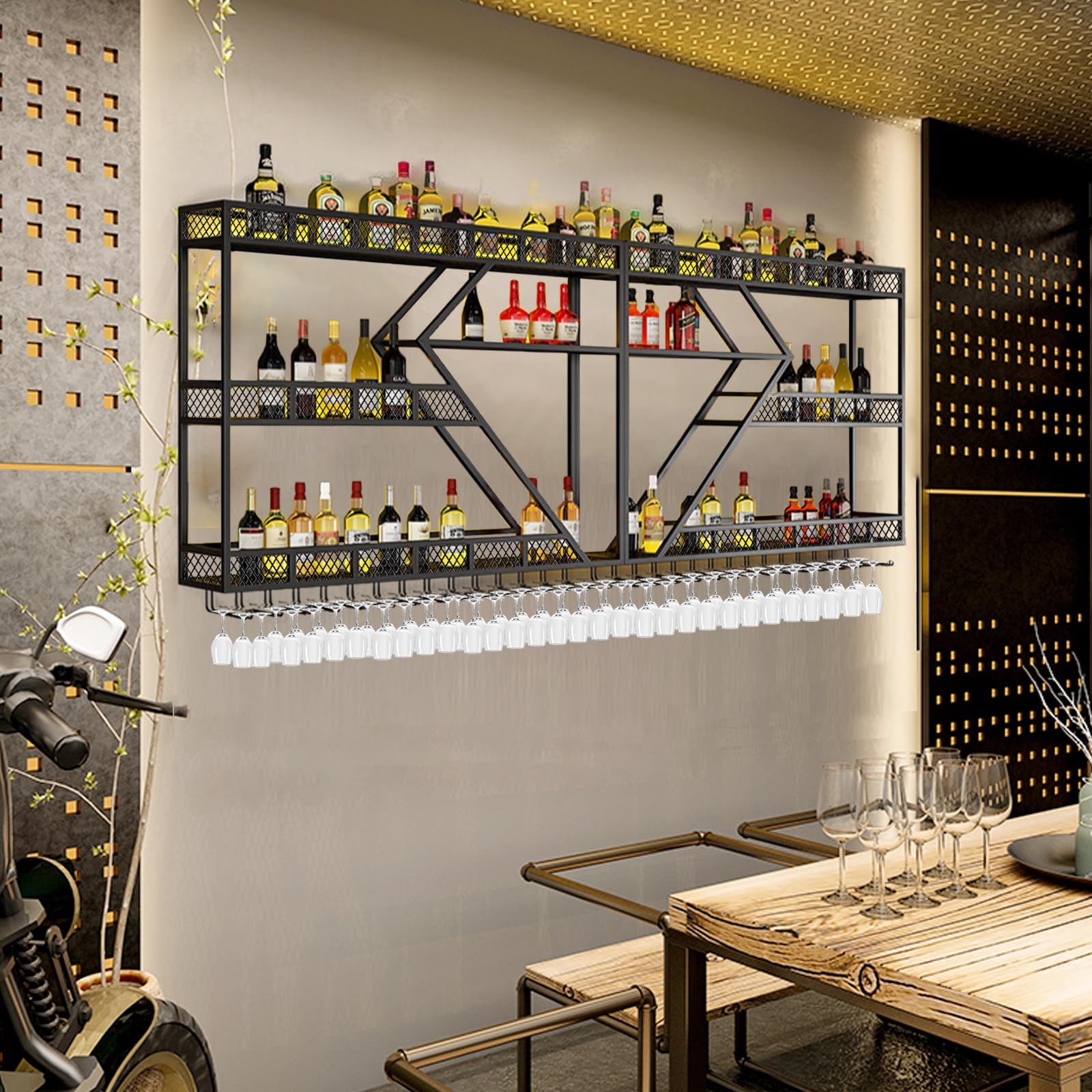 Wow, dieses Weinregal sieht ja klasse aus! Mit 200cm Länge und 3 Ebenen bietet es Platz für viele Flaschen und Gläser. Das Diamant-Design aus robustem Kohlenstoffstahl ist richtig stabil und hält auch volle Flaschen sicher. Schutzgeländer verhindert das Herunterfallen. Einfach an der Wand zu montieren - perfekt für Wohnzimmer, Bar oder Restaurant. Macht sofort was her und ist super praktisch. Auch toll für Spirituosen oder als Deko-Element!