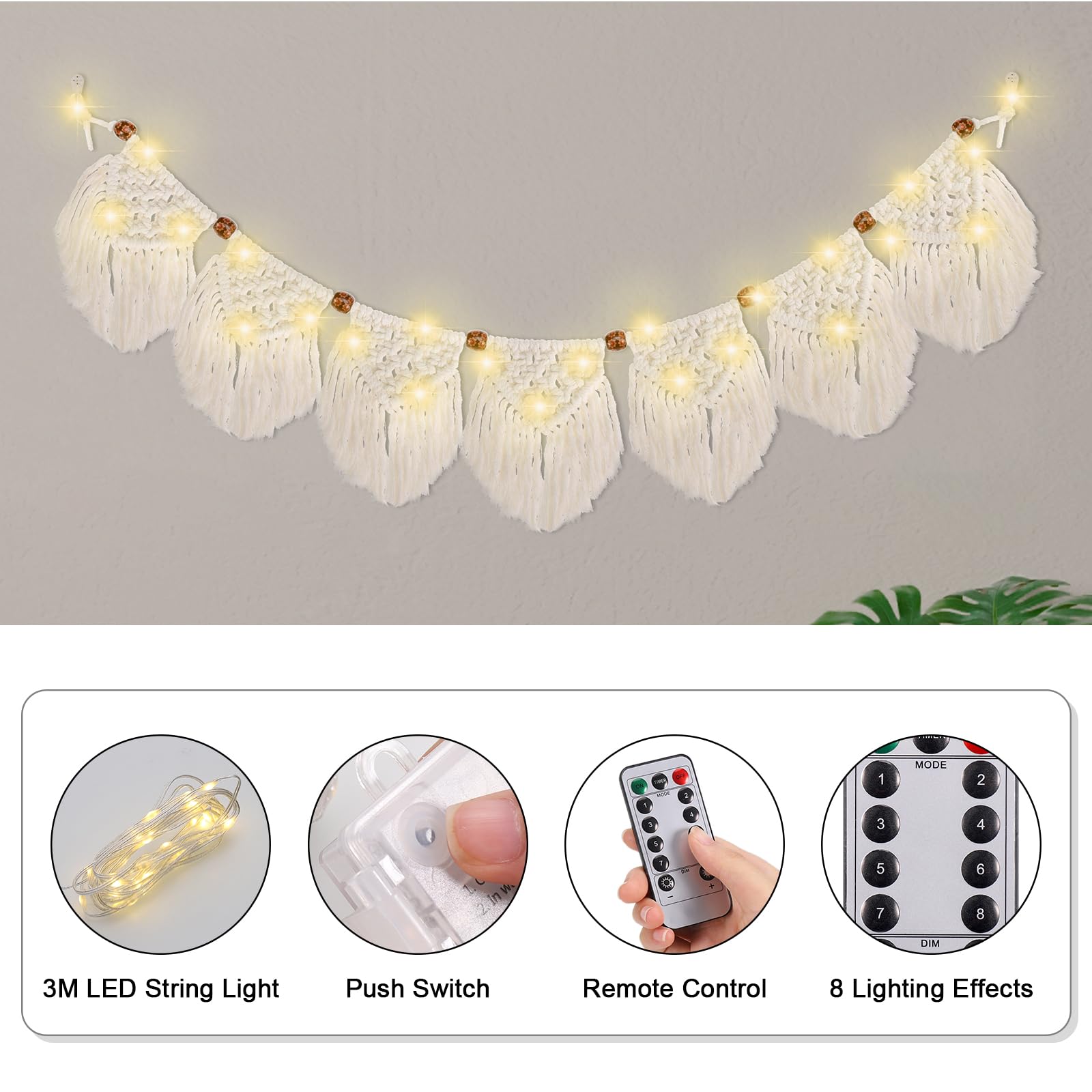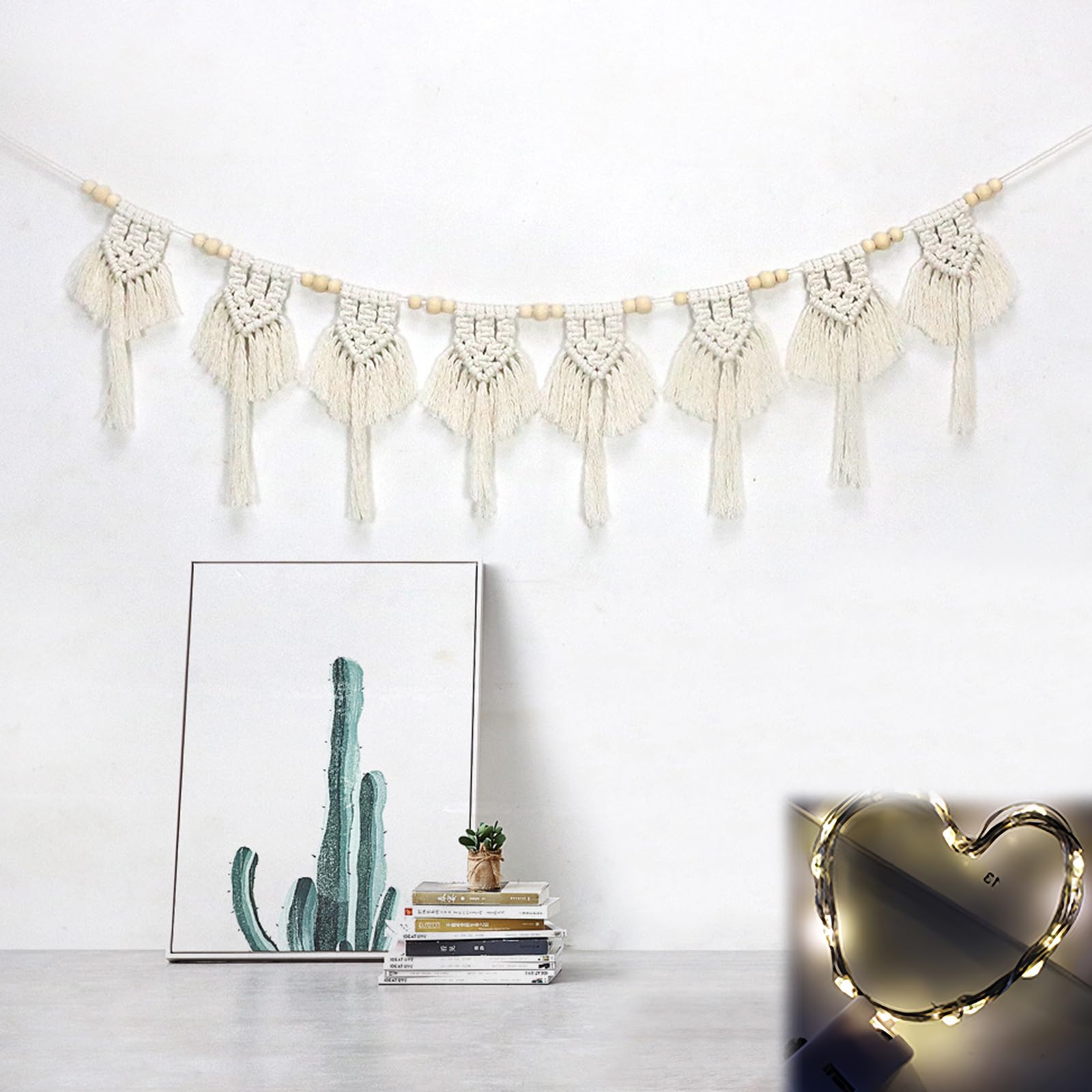 Boah, dieser Makramee-Wandbehang von YAKLEE bringt richtig boho-flair in deine vier Wände! Der 132 cm lange und 14 cm breite Wandteppich besteht aus natürlicher Baumwolle und hat sieben wunderschöne Dreiecke, die du ganz flexibel anordnen kannst. Das absolute Highlight: Die 3 Meter lange warmweiße LED-Lichterkette, die ein total gemütliches Licht zaubert. Mit den beiden beiliegenden Haken kannst du das Ganze super einfach an der Wand befestigen. Die beige Farbe und die Holzperlen verleihen dem Stück diesen typischen boho-chic, der gerade voll im Trend liegt. Du kannst den Wandbehang überall aufhängen: Im Wohnzimmer über dem Sofa, im Schlafzimmer über dem Bett, am Fenster oder sogar über dem Kamin. Er wiegt nur 170 Gramm und ist damit super leicht. Besonders praktisch: Die Lichterkette macht aus dem Wandbehang abends einen echten Eyecatcher! Das ist nicht nur was für dich selbst, sondern auch ein mega Geschenk für Freunde oder Familie, die ihren Wohnraum individuell gestalten wollen. Egal ob für die nächste Party, als Dauer-Deko oder für besondere Anlässe wie Hochzeiten - dieser Makramee-Wandbehang sorgt immer für die richtige Atmosphäre. Einfach aufhängen, LED-Lichter anschalten und schon fühlst du dich wie in einem gemütlichen Café!