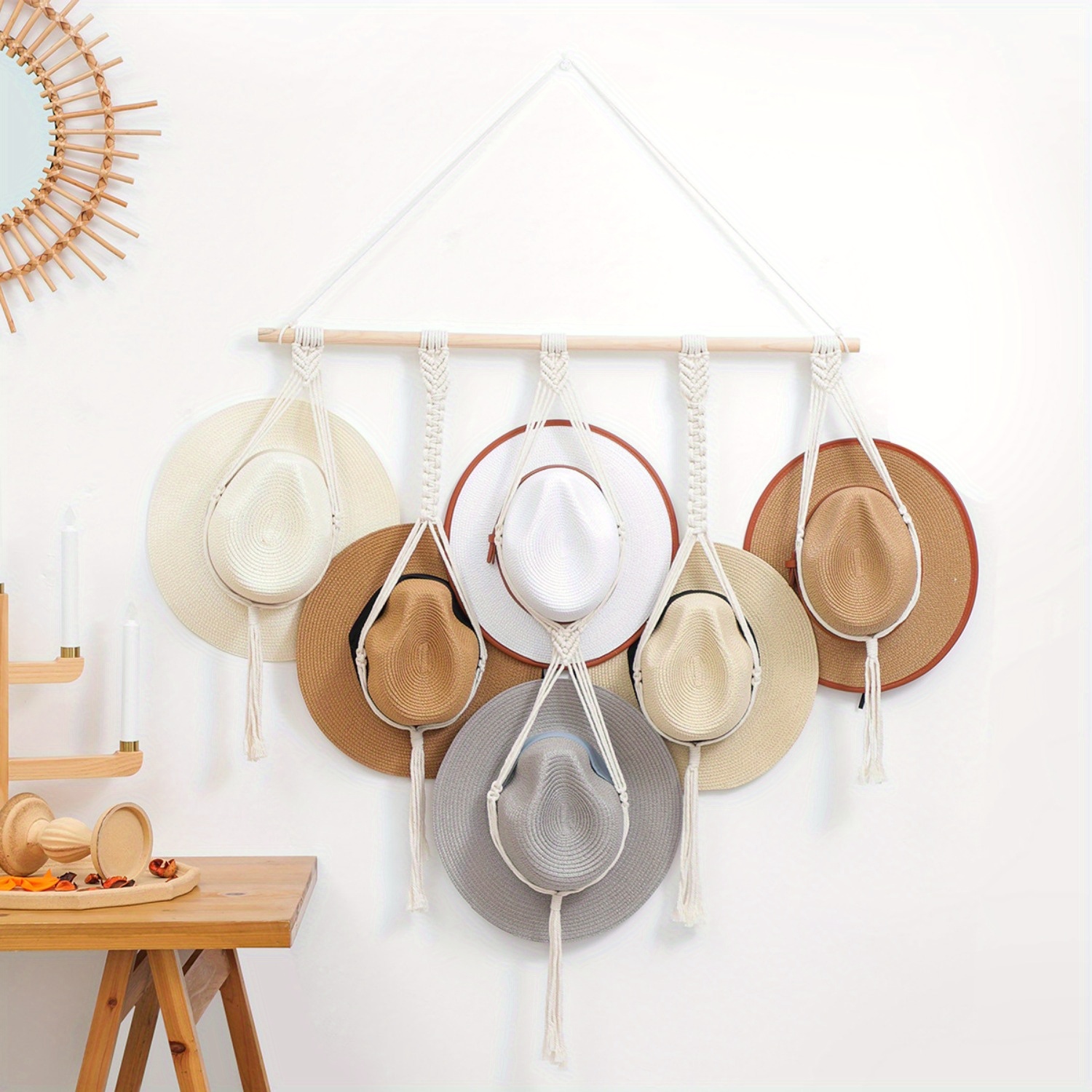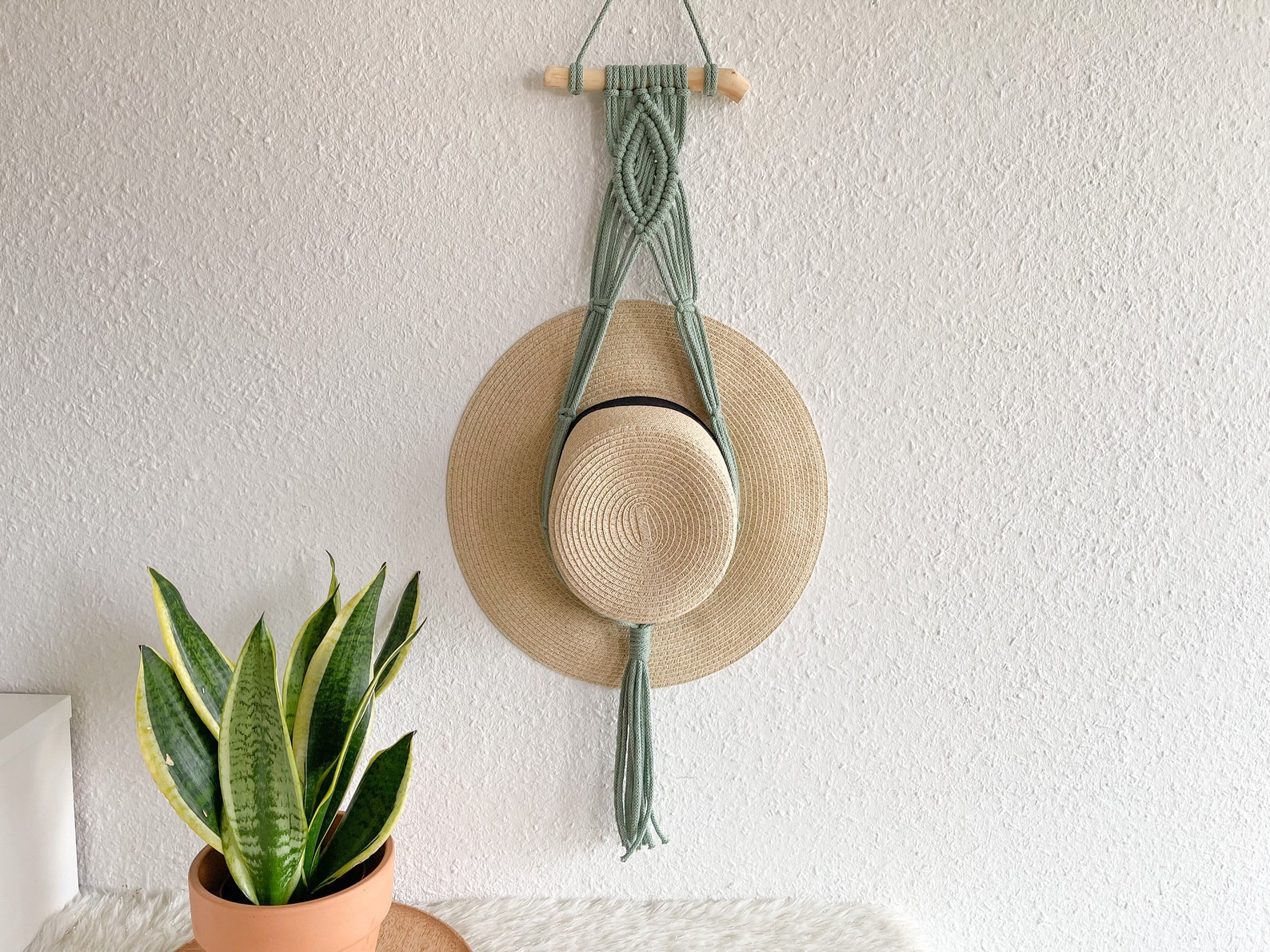 Schluss mit herumliegenden Hüten! Diese 3 handgewebten Makramee-Hutaufhänger bringen Ordnung und Boho-Charme in dein Zuhause. Jeder Ständer ist ein Unikat - handgefertigt aus Baumwollkordel und Kiefernholz. Die drei verschiedenen Farben (Beige, Grün, Gelb) und Längen sorgen für Abwechslung an der Wand. Einfach über einen Haken hängen - keine komplizierte Montage nötig! Perfekt für Fedoras, Cowboyhüte, Sonnenhüte oder Baseballcaps. Sie sehen nicht nur praktisch aus, sondern sind auch eine wunderschöne Wanddekoration. Ob im Flur, Schlafzimmer oder Kleiderschrank - sie verleihen jedem Raum sofort entspannte Vintage-Atmosphäre. Super stabil und langlebig, ohne zu verblassen oder zu brechen. Auch ein tolles Geschenk für Hut-Liebhaber! Endlich haben alle deine Hüte ihren festen Platz und sind trotzdem dekorativ in Szene gesetzt.
