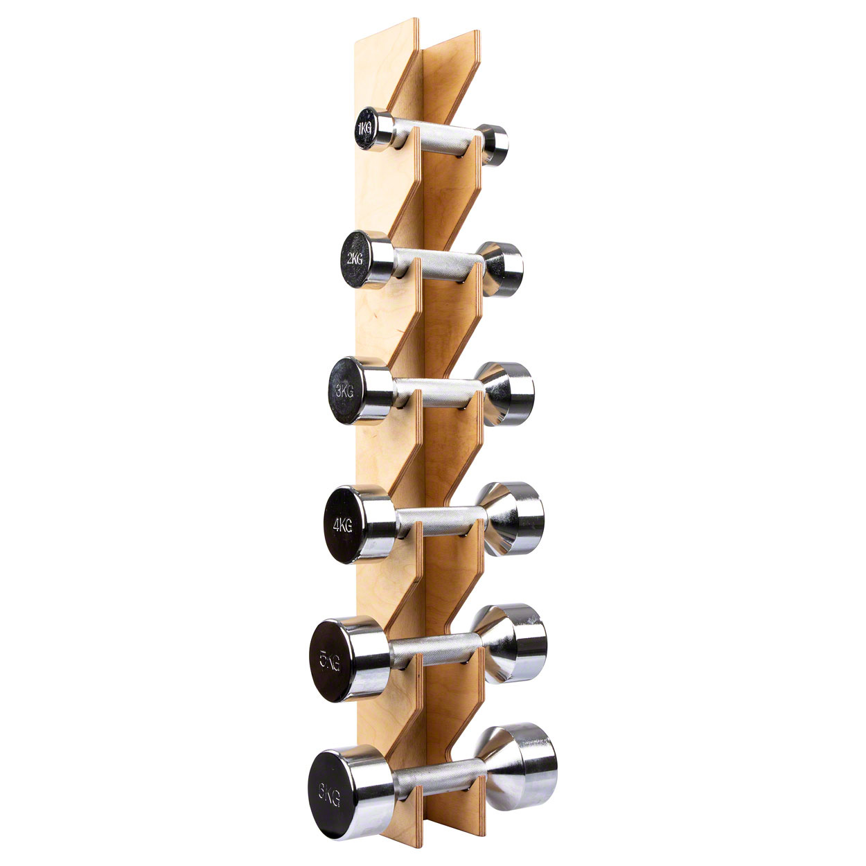 Die vorgegebenen Mulden zeigen genau, wo welche Hantel hingehört - super intuitiv und ohne Vorwissen zu bedienen. Die nach innen abgeschrägten Nischen verhindern, dass die Hanteln versehentlich herausfallen. Einfach an der Wand befestigen und schon hast du deine Gewichte immer griffbereit, aber sicher verstaut.