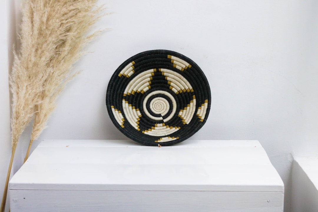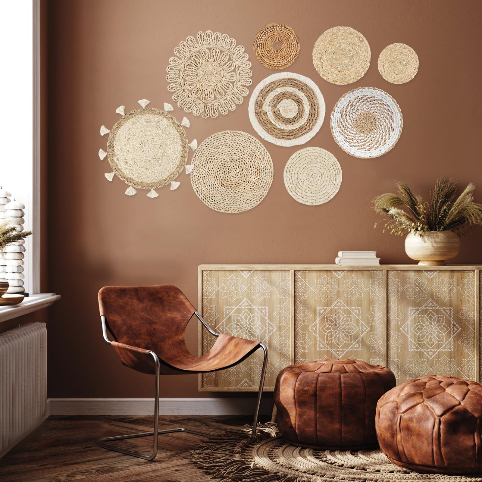 Bring böhmischen Charme in deine vier Wände! Dieses 9-teilige Set aus gewebten Wandkörben in Schwarz verleiht jedem Raum sofort gemütliches Flair. Hergestellt aus natürlichen Materialien wie Rattan, Maisschalen und Baumwollseilen - alles handgewebt von erfahrenen Handwerkern. Die Körbe gibt's in verschiedenen Größen von 10cm bis 33cm, perfekt um sie als Deko an die Wand zu hängen oder praktisch als Obstkörbe zu nutzen. Sie passen super in Wohnzimmer, Schlafzimmer, Büros oder Cafés und verbreiten sofort diese typische Bauernhaus-Atmosphäre. Jeder Korb hat einen praktischen Aufhänger auf der Rückseite. Einfach anbringen und schon verwandelst du deine Wände in eine galerieartige Installation. Tolle Geschenkidee für Einweihungen, Geburtstage oder einfach mal so!
