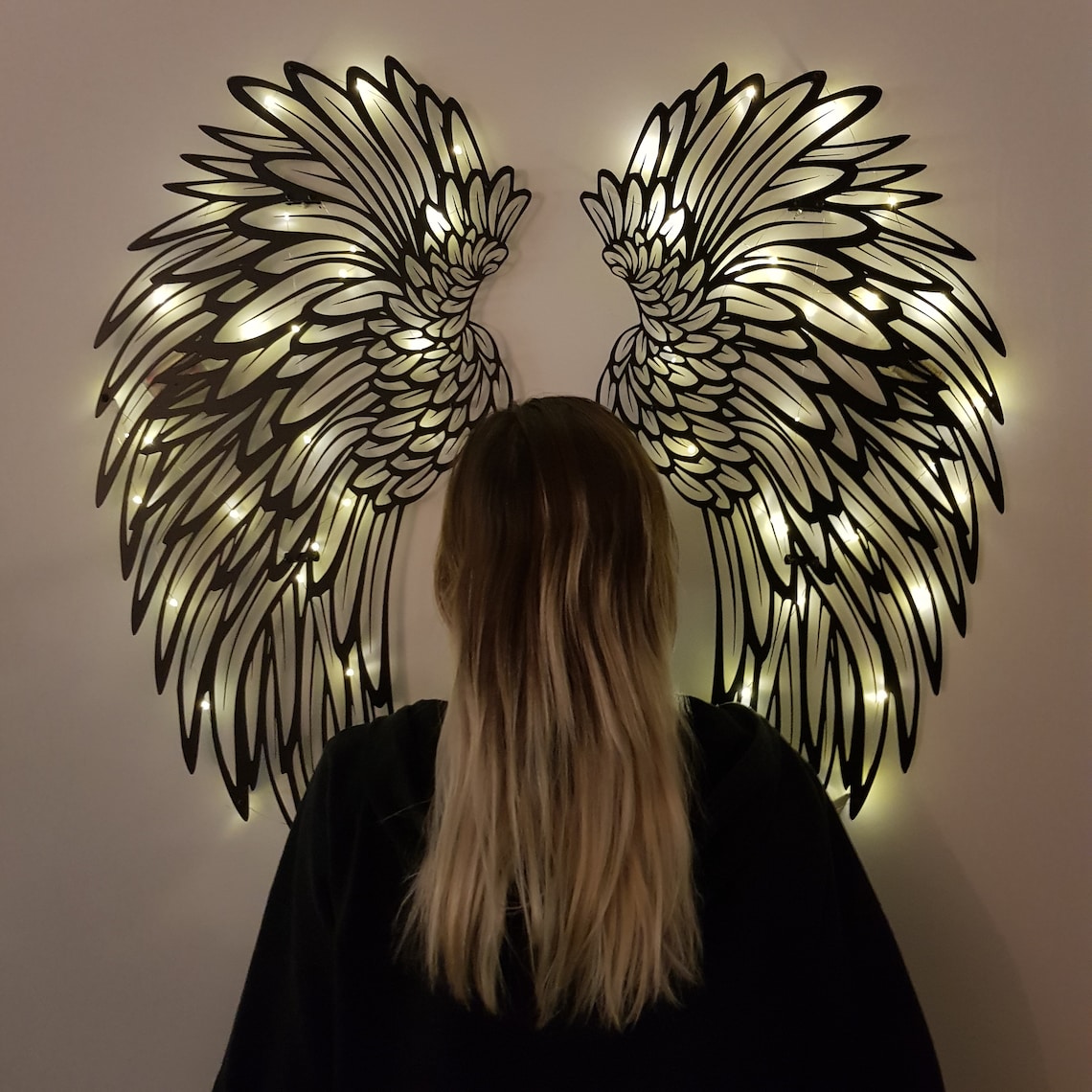 Suchst du eine besondere Deko für deine Wände? Diese Engelsflügel-Wandkunst aus Metall wird zum absoluten Hingucker! Mit 46cm Höhe und 21cm Breite ist sie imposant aber nicht zu groß. Das Beste: Sie hat eine integrierte LED-Lichterkette, die im Dunkeln leuchtet - einfach magisch! Aus robustem Metall gefertigt, rostet nicht so schnell. Du kannst sie nach oben oder unten aufgehängt aufhängen, je nach Geschmack. Perfekt für Wohnzimmer, Schlafzimmer, Kinderzimmer, Balkon oder Büro. Engelsflügel symbolisieren Schönheit, Liebe und Stärke - eine wunderschöne Botschaft für dein Zuhause. Auch ein tolles Geschenk für besondere Anlässe wie Geburtstage, Jubiläen oder Weihnachten. Einfach aufhängen, LEDs anschalten und dich an der bezaubernden Atmosphäre erfreuen!