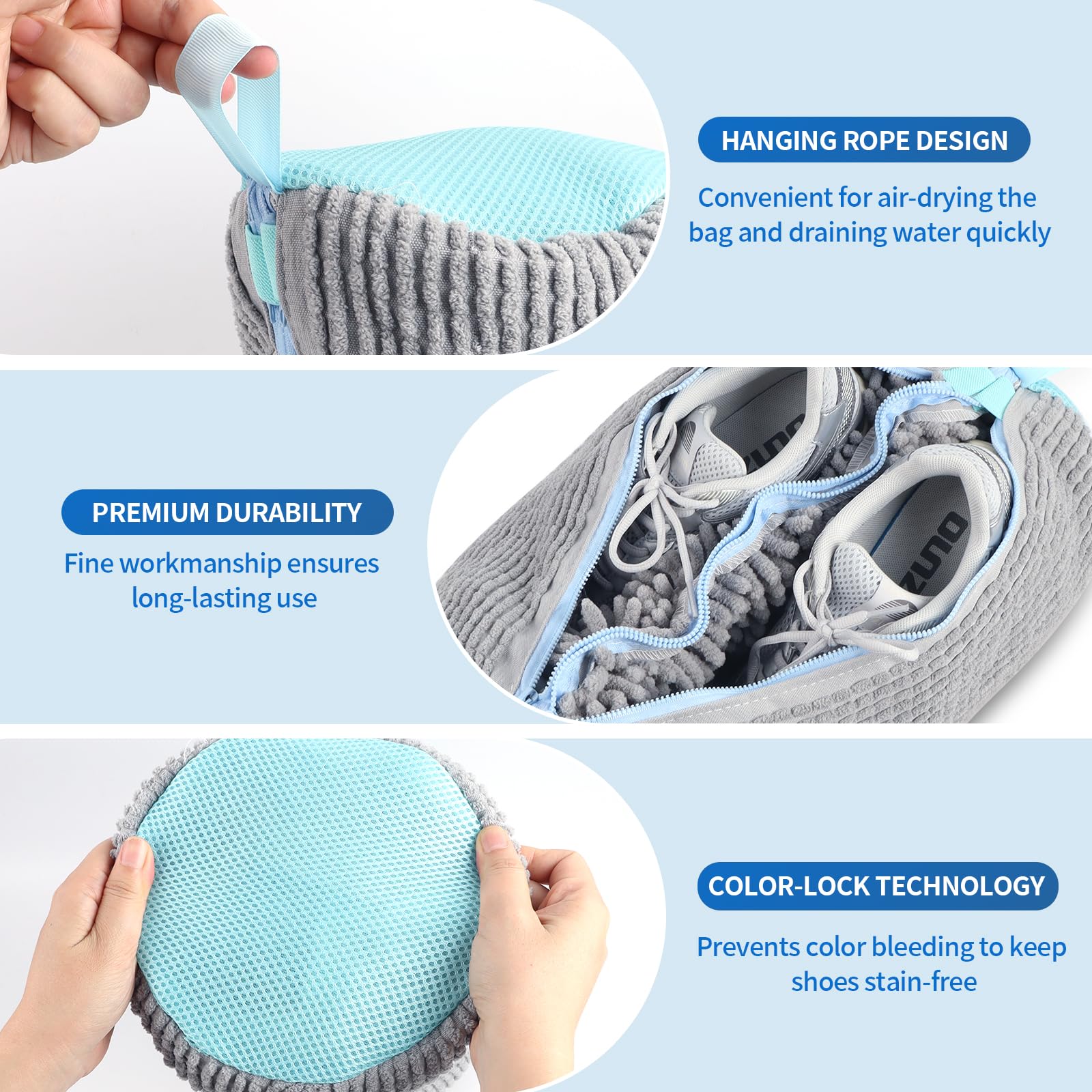 Sneaker-Fans, macht eure Lieblingsschuhe in der Waschmaschine wieder sauber - aber sicher! Diese Schuhwaschbeutel sind die perfekte Lösung. 2 Stück im Set - für beide Schuhe gleichzeitig. Aus reißfestem Polyester - wiederverwendbar und langlebig. Mit Bremsreißverschluss - öffnet sich nicht in der Maschine. Schützt die Schuhe vor Verformung - behalten ihre Form. Schützt auch die Waschmaschine - keine Kratzer von Sohlen oder Reißverschlüssen. 360° Reinigung - die Mikrofaser-Innenseite putzt gründlich aber schonend. Passt für alle Schuhgrößen bis 46 - auch für große Füße. Mit Aufhängehaken - praktisch zum Trocknen. Auch für Sportkleidung, Plüschtiere oder als Reisetasche nutzbar. Einfach Schuhe rein, Beutel zu, in die Waschmaschine - und fertig! Saubere Schuhe ohne Handarbeit - genial praktisch!
