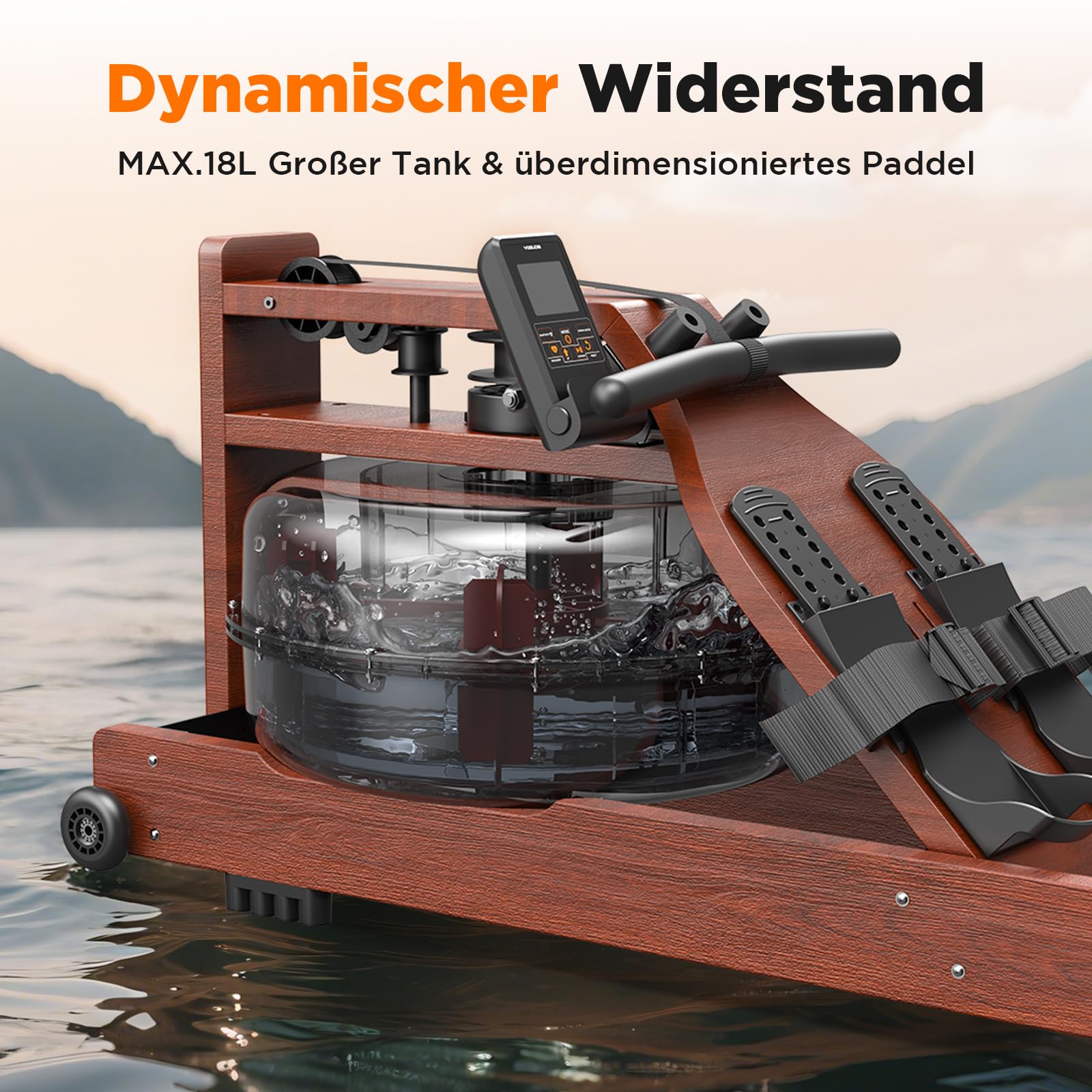 Das platzsparende Rudergerät für zu Hause! Das HAMMER AquaFold besteht aus massivem Echtholz und sieht einfach klasse aus. Mit dem 12-Liter Wassertank hast du ein super natürliches Rudergefühl - fast wie auf dem See! Der Widerstand lässt sich in 6 Stufen über den Wasserstand einstellen. Nach dem Training klappst du es einfach zusammen und schiebst es mit den 4 Rollen weg - super praktisch bei wenig Platz. Der Trainingscomputer zeigt dir alle wichtigen Daten und per Bluetooth connectest du mit Fitness-Apps. 99% vormontiert - in wenigen Minuten startbereit! Schont die Gelenke und trainiert den ganzen Körper perfekt. Ideal für Einsteiger und Fortgeschrittene. Ob morgens vor der Arbeit oder abends vor dem TV - mit diesem Rudergerät machst du jedes Workout zum Erlebnis. Einfach aufbauen, Wasser rein und losrudern!
