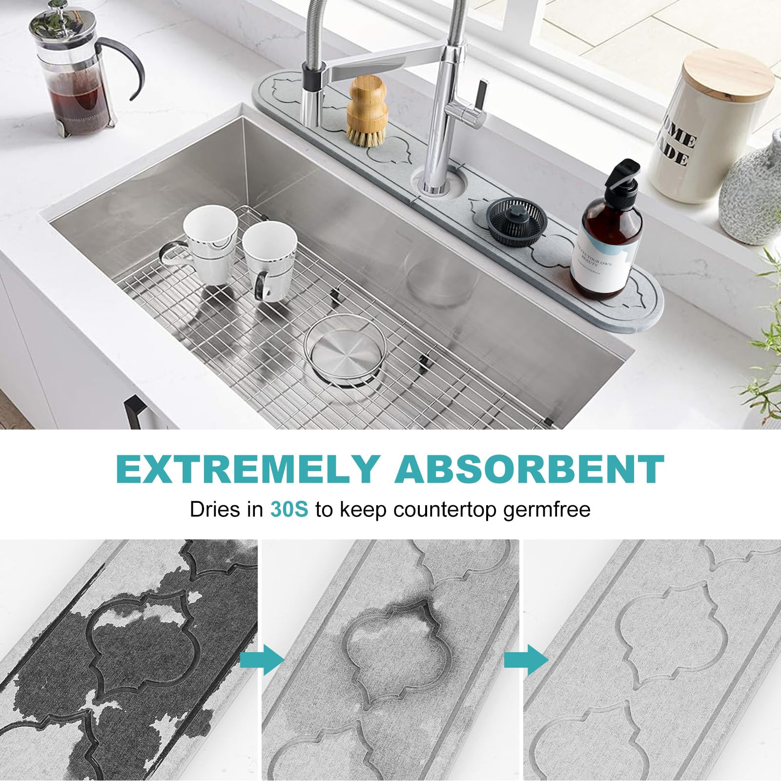 Genervt von Wasserpfützen ums Waschbecken? Diese wasserabsorbierende Spülbeckenmatte mit Kieselgur ist die Lösung! Sie saugt Feuchtigkeit blitzschnell auf und hält deine Küchen- und Badezimmeroberflächen trocken und ordentlich. Mit rutschfester Unterseite bleibt sie sicher an Ort und Stelle - kein Verrutschen mehr beim Heraussteigen aus der Dusche oder am Waschbecken. Die Matte trocknet selbst schnell, beugt Wasseransammlungen vor und minimiert so die Schimmelbildung. In eleganter Optik (weiß oder grau) passt sie zu jedem Einrichtungsstil. Maße: 40x10cm. Reinigung? Ganz einfach: Mit feuchtem Tuch abwischen oder unter fließendem Wasser abspülen. Im Lieferumfang: 2x Wasserhahn-Pads, 1x Schleifpapier, 8x Gummifüße für zusätzliche Stabilität. Praktisch, hygienisch und stylisch - diese Matte macht dein Badezimmer und deine Küche sicherer und sauberer!