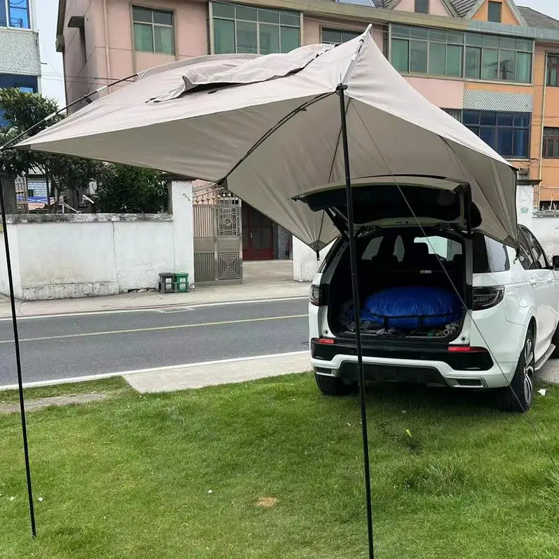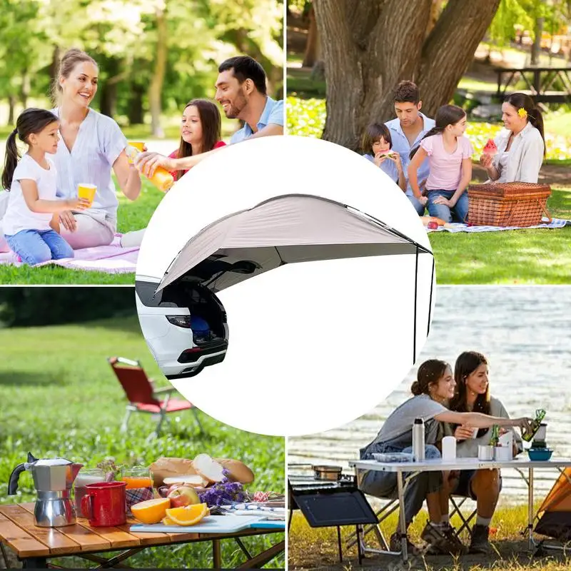 Endlich Schatten wo immer du bist! Diese Auto-Markise ist dein bester Freund bei Outdoor-Aktivitäten. Mit 380x280cm Größe bietet sie reichlich Platz für 4-6 Personen. Aus silberbeschichtetem wasserdichtem Material, hitzeisolierend und UV-beständig. Einfach an der Heckklappe oder Seite deines SUVs, Transporters oder Limousine befestigen. Im Lieferumfang: 2 Stützstangen (2m, 16mm Durchmesser), 6 Heringe, 6 Spanngurte und eine Tragetasche. Nur 1,6kg schwer - passt in jeden Kofferraum. Perfekt für Angeln, Strandtage, Camping oder einfach nur zum Chillen in der Natur. In Sekunden aufgebaut und schon hast du deinen eigenen Schattenplatz!