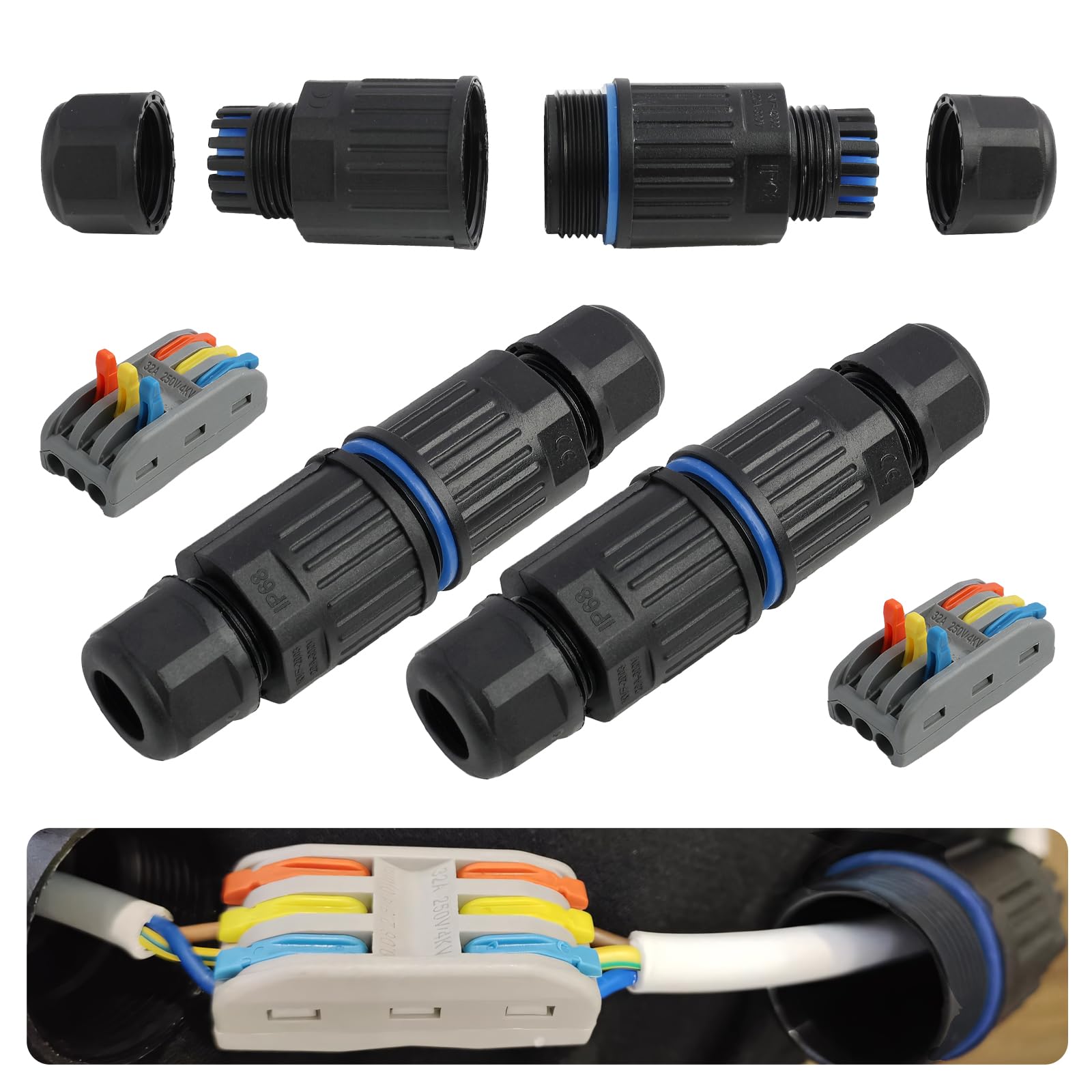 Diese 2 wasserdichten Kabelverbinder mit IP68-Schutz sind die perfekte Lösung für alle Outdoor- und Industrieanwendungen! Mit ihrer robusten Bauweise aus PC-Gehäuse, Silikondichtungsring und elastischen Nylonverbindungen halten sie wirklich alles aus: Sonne, Regen, Staub und Stöße. Die IP68-Zertifizierung garantiert absoluten Schutz gegen Wasser und Staub - selbst bei widrigsten Wetterbedingungen. Besonders praktisch: Die Schnellverdrahtung und Steckverbindung ermöglichen eine werkzeuglose Installation! Einfach die Kabel (Durchmesser 4-10mm) anschließen und fertig. Die Verbinder unterstützen bis zu 3 Pole und bieten damit flexible Anschlussmöglichkeiten für verschiedene Anwendungen. Hergestellt aus hochfestem ABS und Metall für maximale Langlebigkeit und Zuverlässigkeit. Perfekt geeignet für Gartenbeleuchtung, landwirtschaftliche Anlagen, LED-Leuchten, Außeninstallationen oder industrielle Projekte. Ob du Heimwerker bist oder Profi - mit diesen Kabelverbindern machst du nichts verkehrt. Sie sorgen für sichere und dauerhafte Verbindungen, egal ob im Innen- oder Außenbereich. Einfach unverzichtbar für alle elektrischen Installationen im Freien!