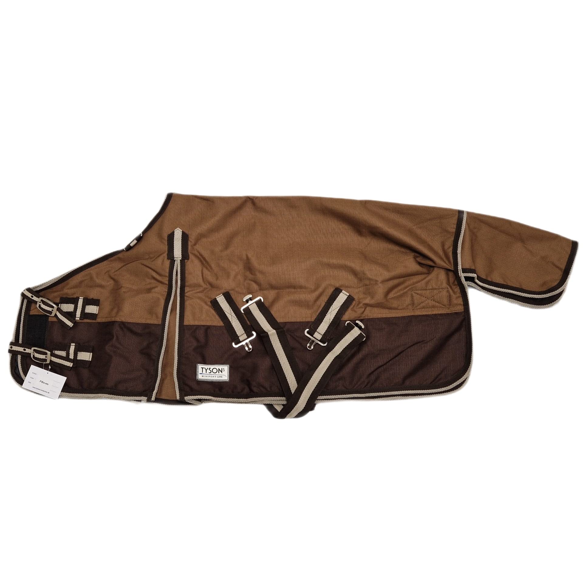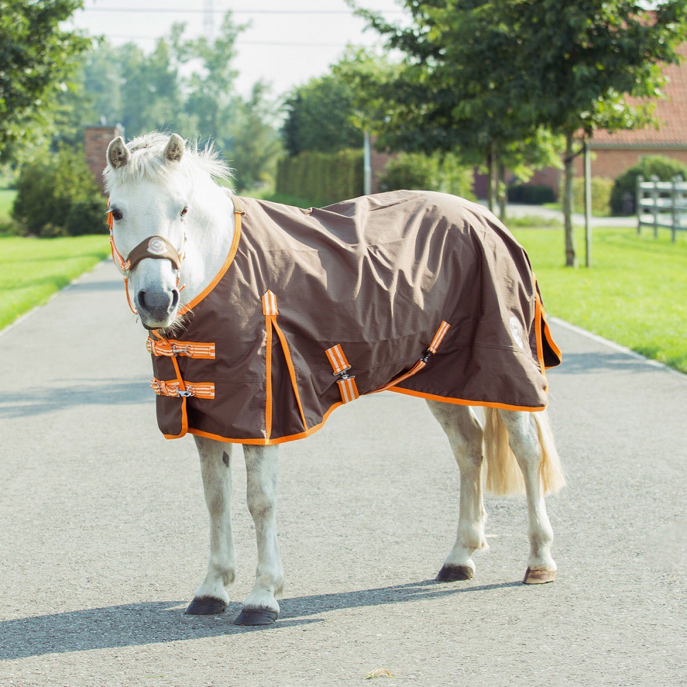 Dein Pony verdient den besten Schutz bei Regenwetter! Diese High-End Regendecke in Dunkelbraun/Schwarz (Größe 115) ist perfekt für Mini Shetlands, Shettys und Ponys. Aus 600D Polyester Rip-Stop mit 3000mm Wassersäule - absolut wasserdicht und atmungsaktiv. Der doppelte Frontverschluss ist auch für Kinderhände leicht zu bedienen. Kreuzgurte und elastische Beinschnüre halten die Decke sicher am Platz. Die Gehfalten geben volle Bewegungsfreiheit - auch für wilde Bocksprünge! Verschweißte Nähte, maschinenwaschbar. Dein Pony wird's dir danken!