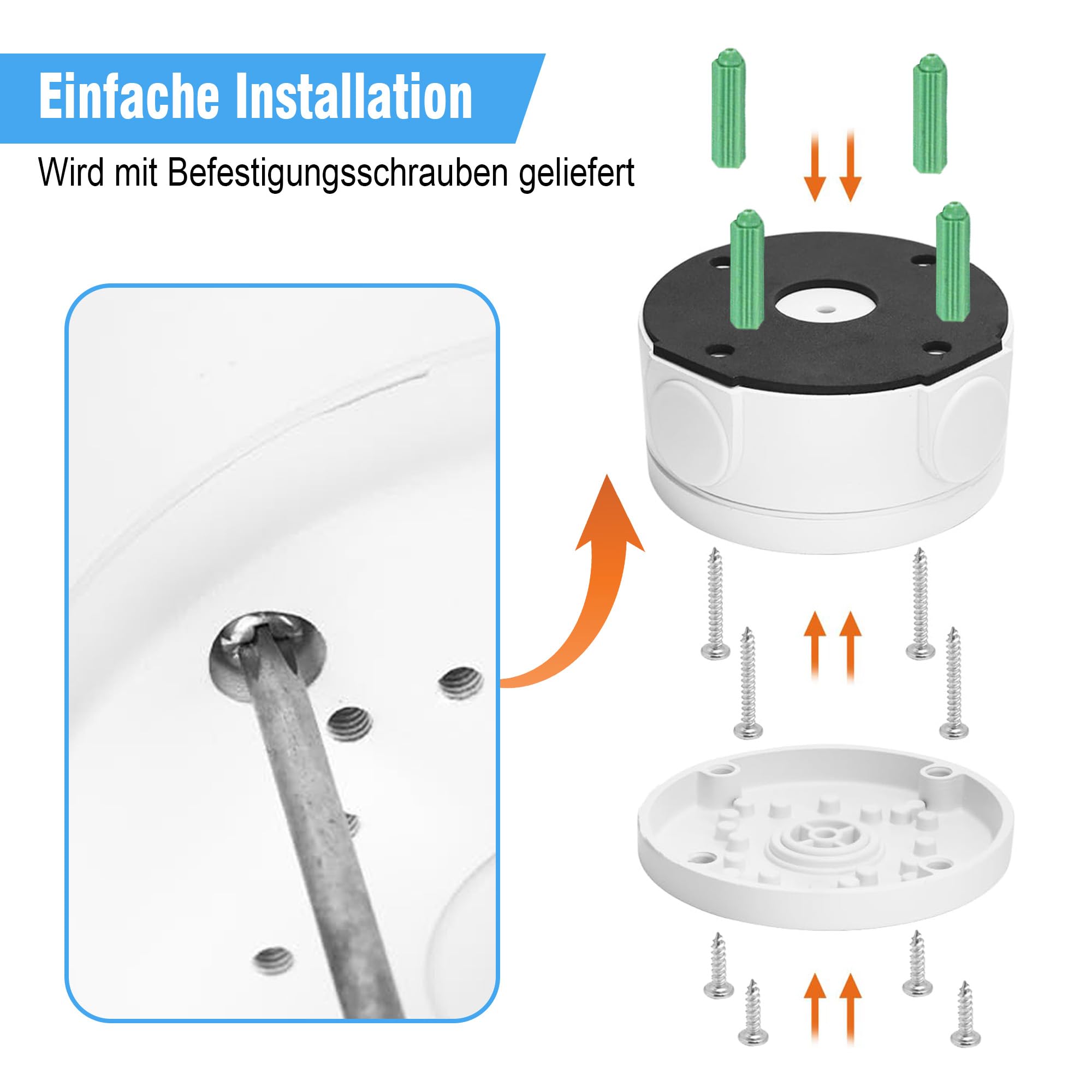 Professioneller Schutz für deine Überwachungskamera! Diese robusten Aluminium-Anschlussdosen halten Kabel und Anschlüsse sicher vor Wetter und Vandalismus. \\n\\nTechnische Details: \\n• Aus Metall-Aluminium - rostfrei und extrem stabil \\n• Maße: 10,5 x 4,8 cm - kompakt aber geräumig \\n• Öffnung: 2,5 cm - für die meisten Kamerakabel \\n• Wasserdicht - hält Regen und Schnee stand \\n• Mit Montagematerial - sofort einsatzbereit \\n\\nEinfache Installation: \\n• An Wand oder Decke montieren \\n• Kabel ordentlich verlegen \\n• Kamera anschließen \\n• Dose verschließen - fertig! \\n\\nVorteile: \\n• Kabelschutz - vor Wetter und Beschädigung \\n• Ordnung - keine herumhängenden Kabel mehr \\n• Langlebig - hält Jahre lang \\n• Universell - für die meisten Kamera-Modelle \\n\\nEinsatzorte: \\n• Private Häuser und Gärten \\n• Geschäfte und Büros \\n• Lagerhallen und Fabriken \\n• Baustellen und Außenbereiche \\n\\nOb du jetzt eine neue Kamera installierst oder bestehende Anschlüsse schützen willst - mit diesen Dosen ist deine Technik sicher vor Wind und Wetter. Und das Set mit 4 Stück reicht für mehrere Kameras!